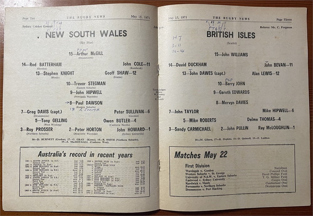 Sydney Cricket Ground. In good condition Centre crease. On team page Scorers notes and progressive scores listed, Replacement noted. 1 from Act and 4 NSW Country. Interestingly - The results of the previous 35 tests 1961-1970 also noted, Aust had won 10 and drawn 1 with 24 lost. Reduced from $200 to $150.