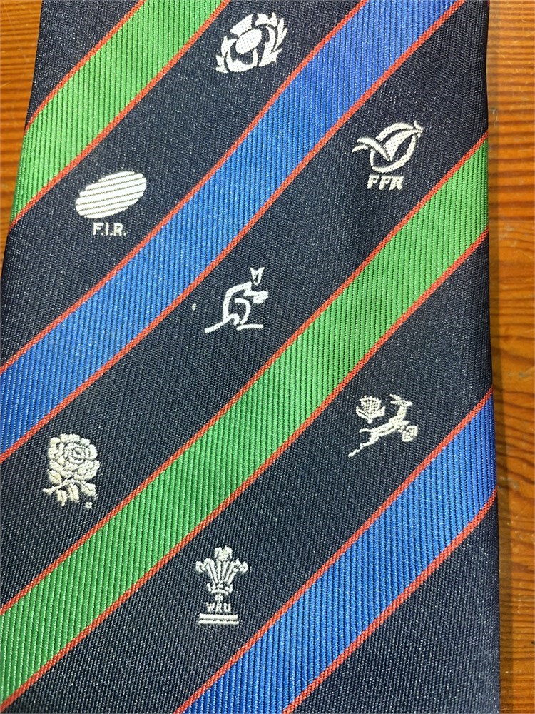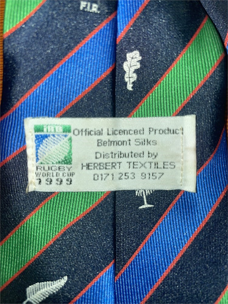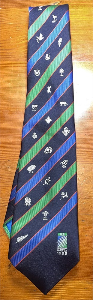 Official licensed product made by Belmont Silks. Navy tie with green and blue stripes. Feature IRB RWC 199 logo and then repeated logos of the 20 participants. Reduced from $25