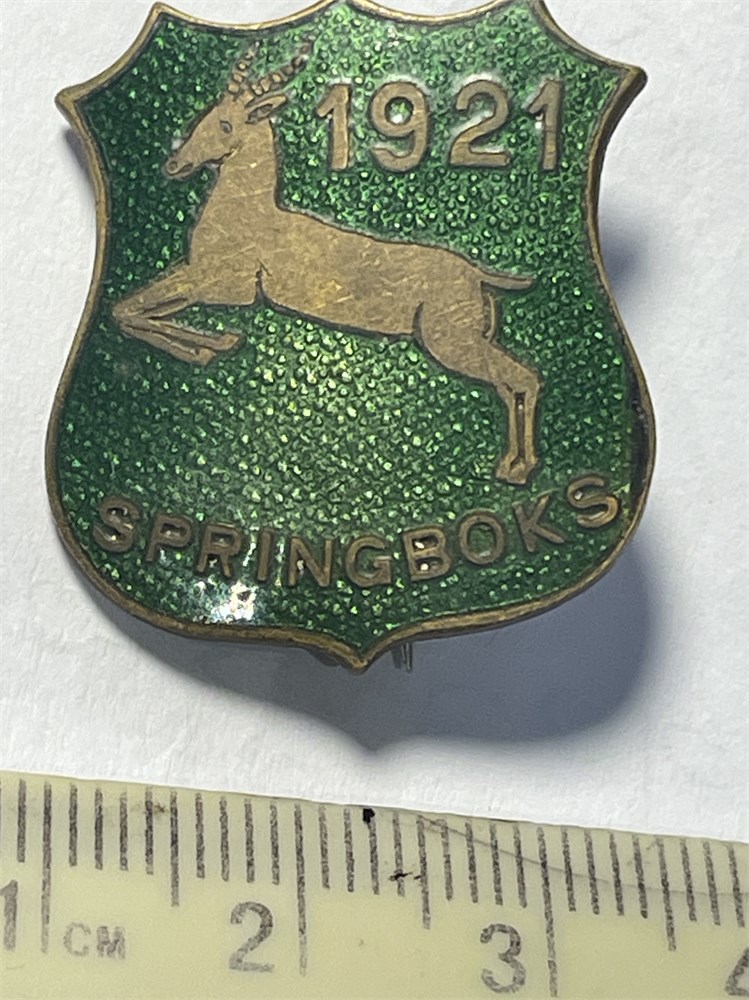 A green enamel 1921 Springboks Tour badge. With '1921" and Springboks' in bronze and a jumping Bok motif. (250mm at widest and 300mm high) In excellent condition. Each auction will remain OPEN for 5 minutes after the last bid has been made.