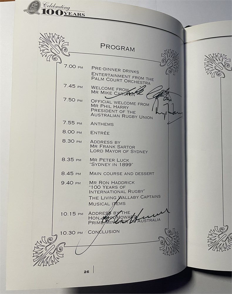 The dinner programme on pages 26-27 further signed by Mike Carlton MC, Phil Harry ARU President and John Howard (PM).