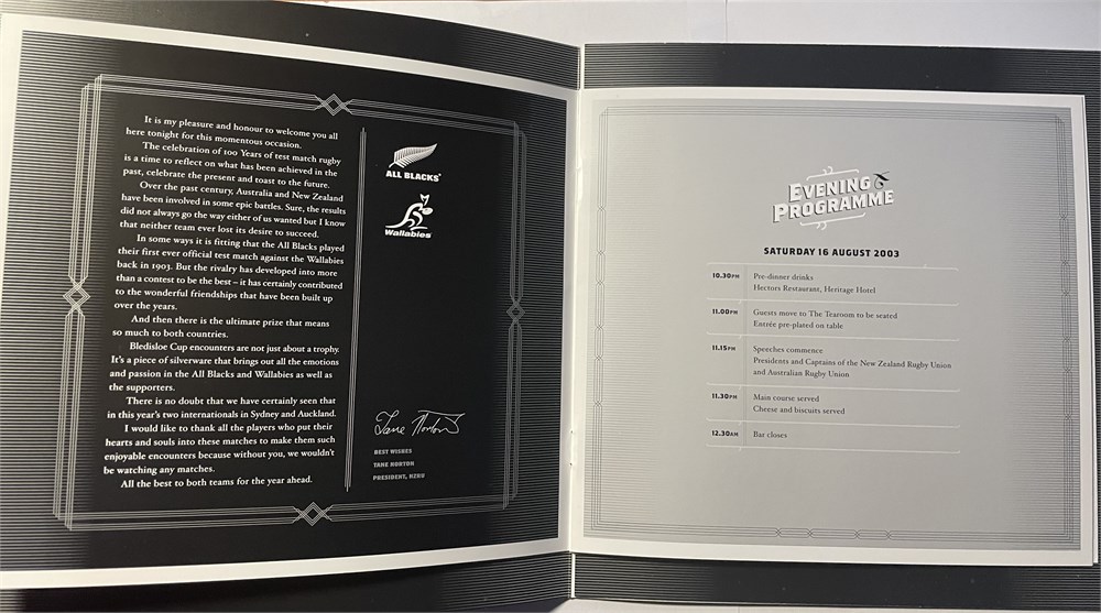 2003 Celebrating 100 years of New Zealand Test Rugby held Saturday 16th August 2003. Produced by NZ Rugby Union. Each auction will remain OPEN for 5 minutes after the last bid has been made.