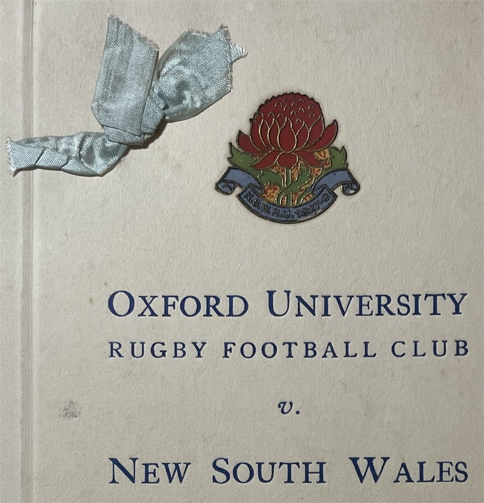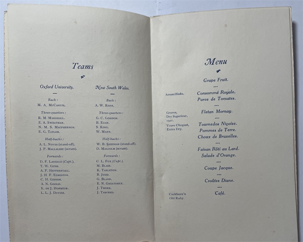 Dinner Menu Clarendon Hotel Oxford October 27th 11927. Menu and Both teams listed. Folded card with paper insert. Embossed with colour NSWRU 1927-28 Waratah and OUFCU Crown. With sky blue and navy blue ribbon. In very good condition. Beautifull item. Each auction will remain OPEN for 5 minutes after the last bid has been made.