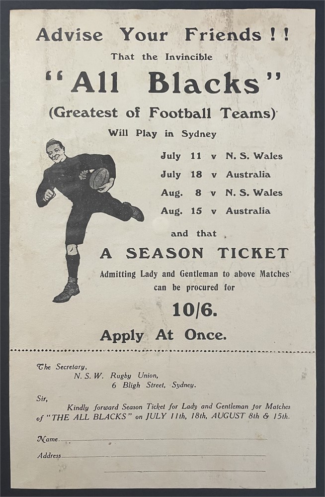Cheque, Direct deposit or Credit card (MasterCard or Visa)application. Produced by NSWRU. "Advise your friends!! That the invincible 'All Blacks" (greatest of Football teams" will play in Sydney. The claim came true as they were undefeated in the 10 games in Australia,