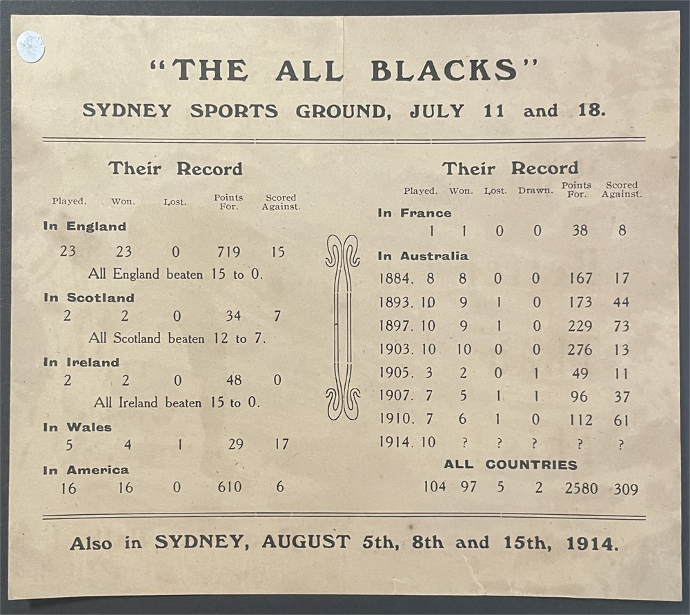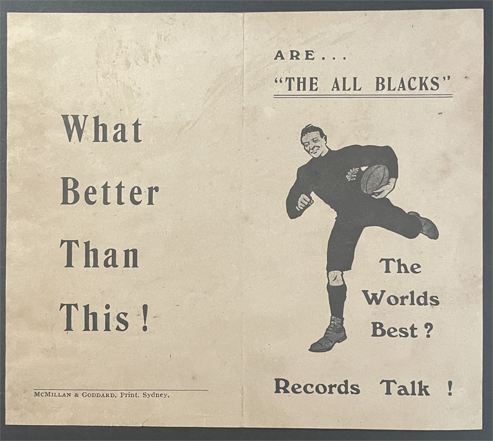 A single page folded which sets out The All Blacks record. Printed by McMillan & Goddard. Rare. Each auction will remain OPEN for 5 minutes after the last bid has been made.
