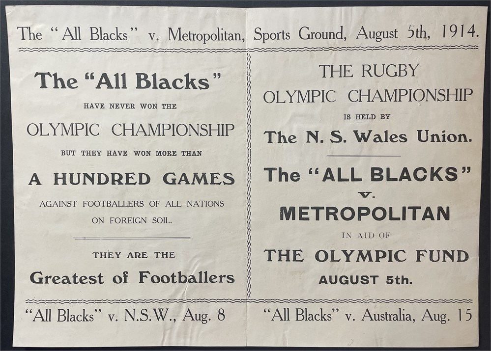 Promoting the All Blacks v Metropolitan Game 5th August 1914 . The game entitled the Rugby Olympic Championship. In aid of The Olympic Fund. Note the next scheduled games in 1916 was to be held in Berlin (there had been awarded in 1912). Each auction will remain OPEN for 5 minutes after the last bid has been made.