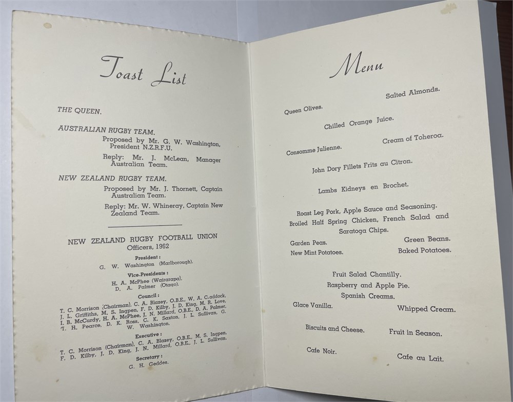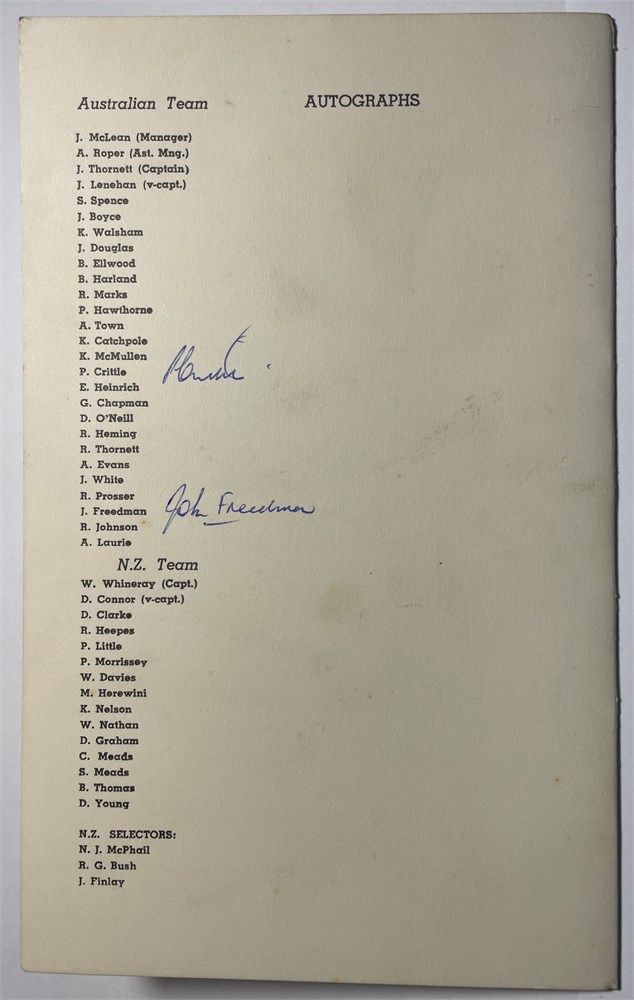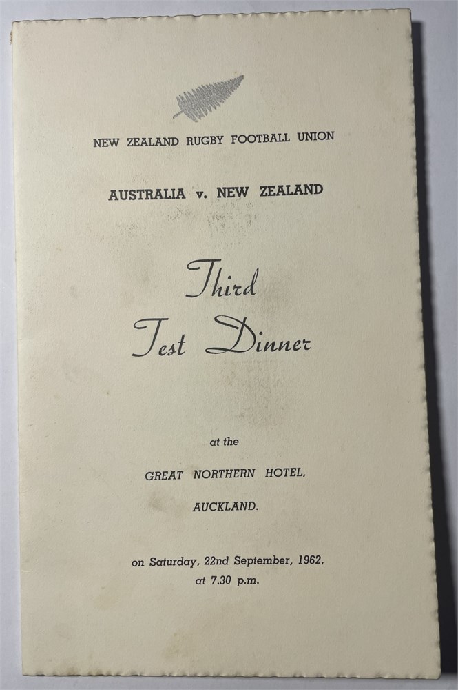 A folded card for Test dinner at Great Northern Hotel, Auckland 22 Sept 1962 following the 3rd Test New Zealand v Australia at Eden Park. Toast List, menu and both teams listed on back cover. Signed by Peter Crittle and John Freedman. Each auction will remain OPEN for 5 minutes after the last bid has been made.
