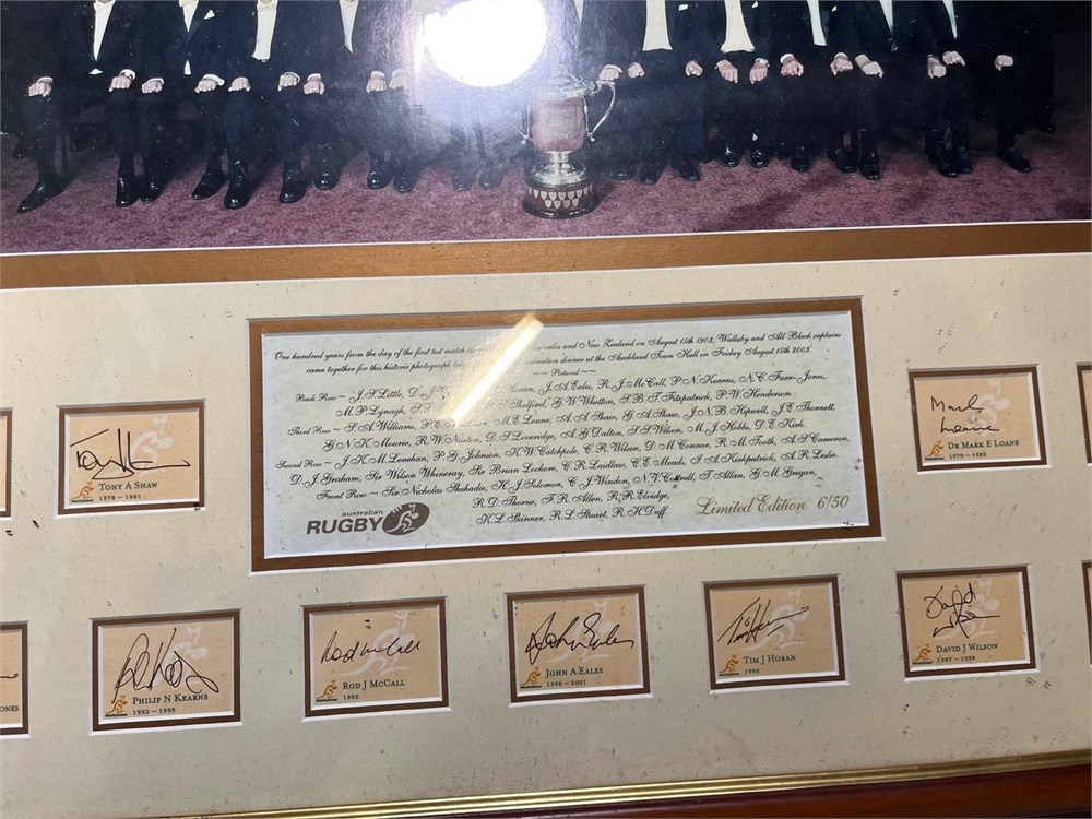 Signed by 29 Australian test captains. Signed by Allan, Cottrell, Windon, Solomon, Shehadie, Cameron, Tooth, Connor, Wilson, Catchpole, Johnson, Lenehan, Thornett, Hipwell, Shaw, Shaw. T, Loane, McLean, Williams, Poidevin, Farr-Jones, Lynagh, Kearns, McCall, Eales, Horan, Wilson. Little, Gregan.