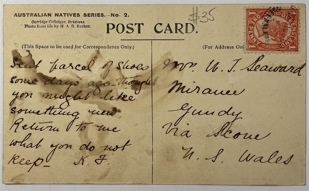 Used postcard 'Australian Natives Series no. 2' On front printed 'Well marked, Sir!" Crease. Good condition. Each auction will remain OPEN for 5 minutes after the last bid has been made.