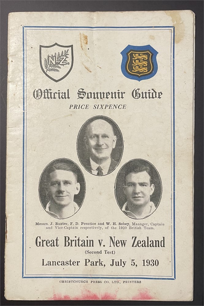 Lancaster Park July 5, 1930.Cover soiled and scuffed. Staples rusted. Has crease. Small repair to team list page. In Good condition. Each auction will remain OPEN for 5 minutes after the last bid has been made.