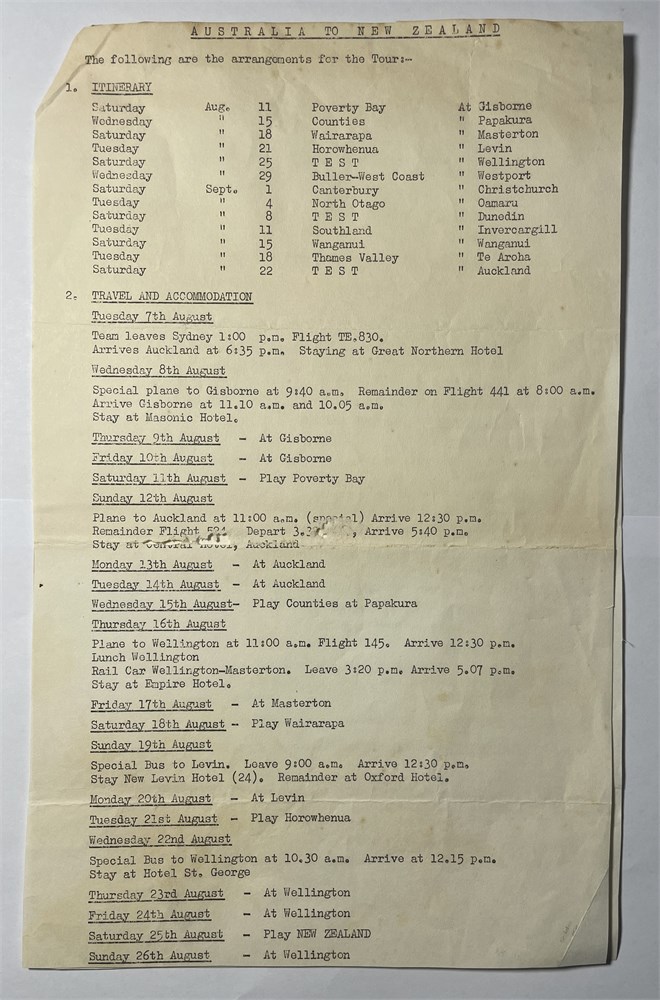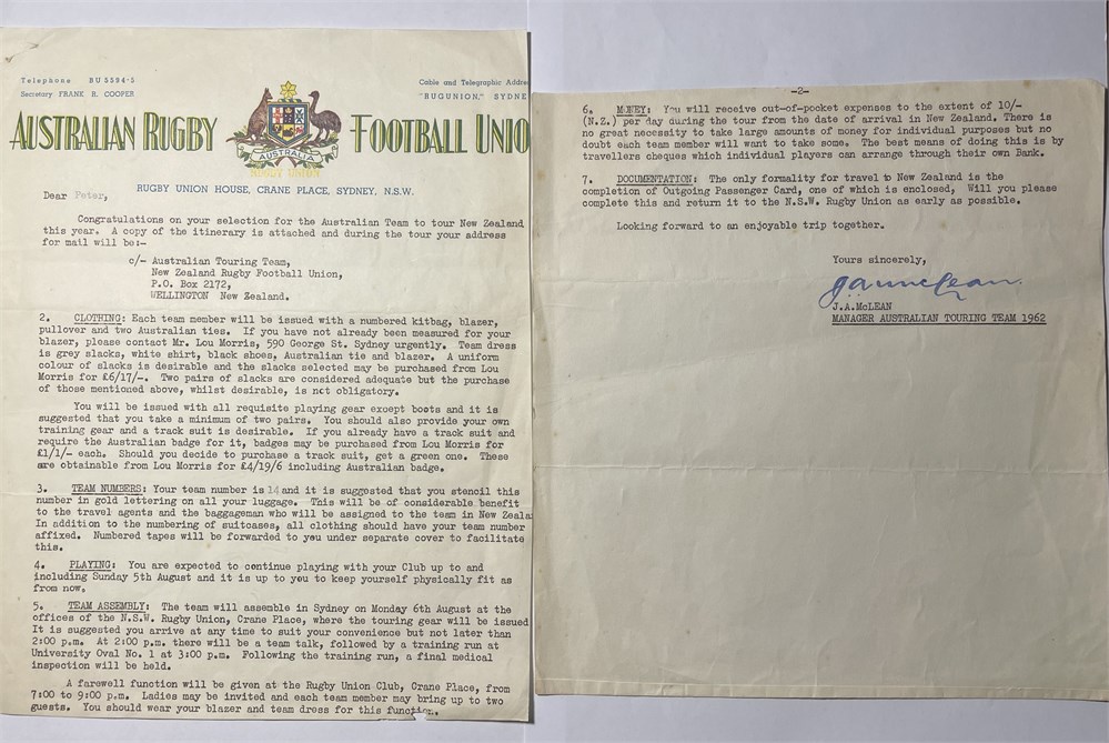 A 2-page letter on Australian Rugby Football Union letterhead, addressed to Peter Crittle advising 0f his selection and tour number (# 14) Sets out kit allocation and team assembly. Also, a 2-page Itinerary for team - matches, travel and accommodation. Each auction will remain OPEN for 5 minutes after the last bid has been made.