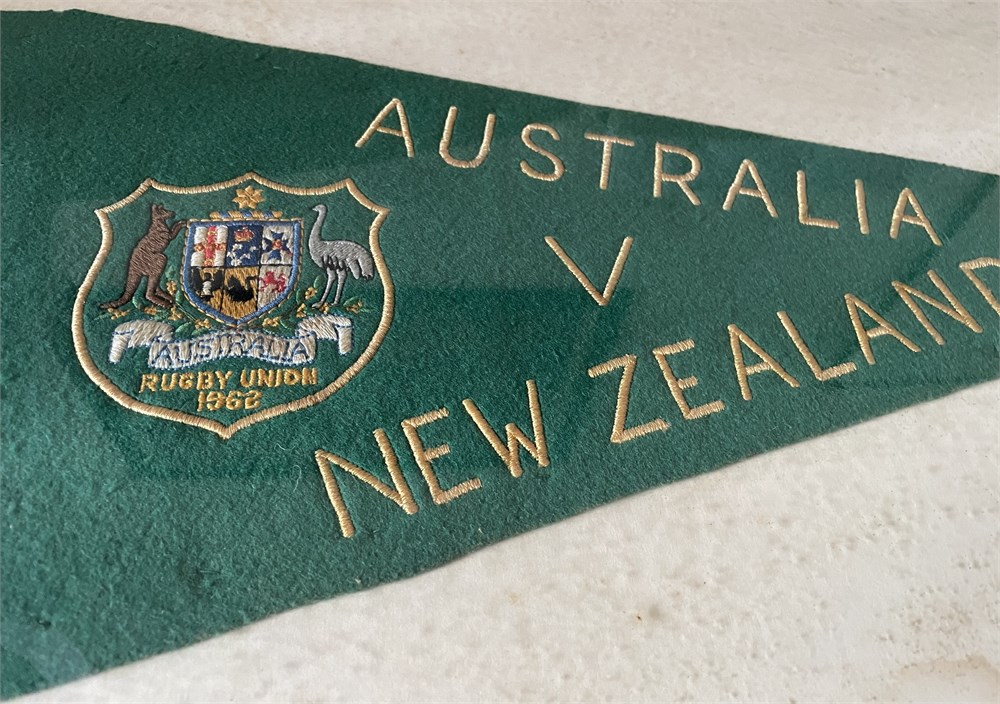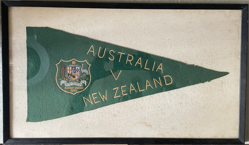 Framed Touch Flags from NZ Test 1962. Green felt with Australian Rugby Coat of Arms. Some dame to felt (490mm x 220m high). Each auction will remain OPEN for 5 minutes after the last bid has been made.