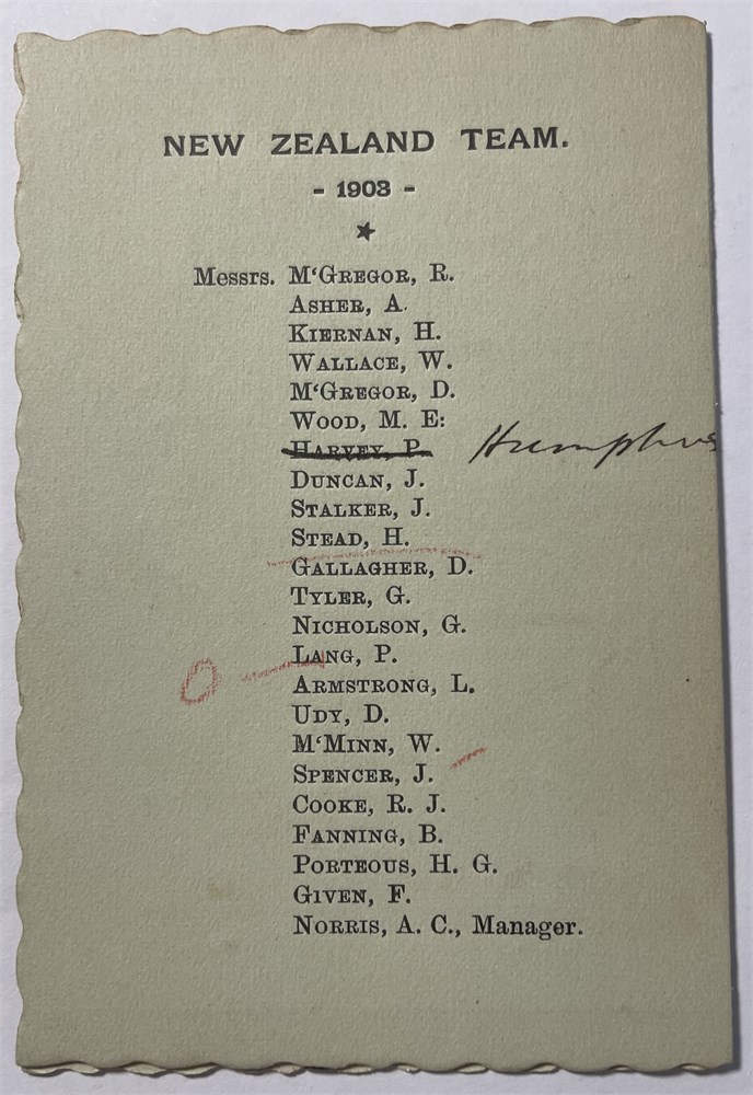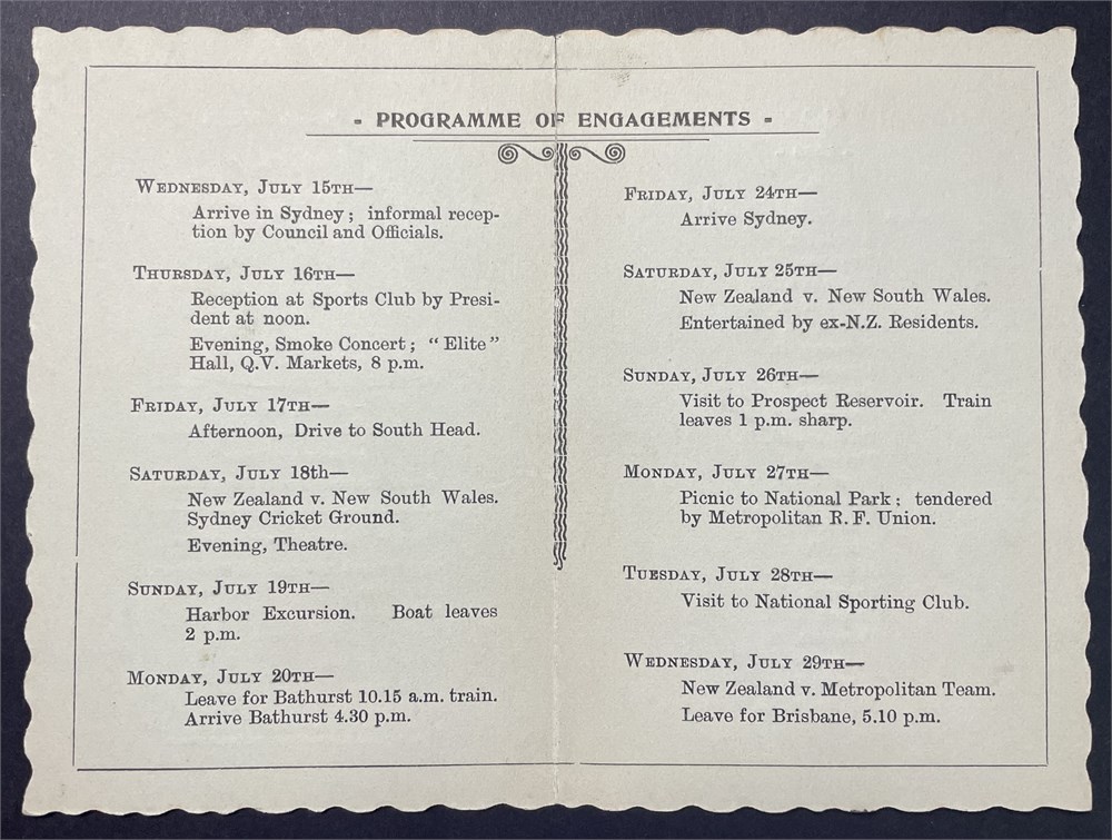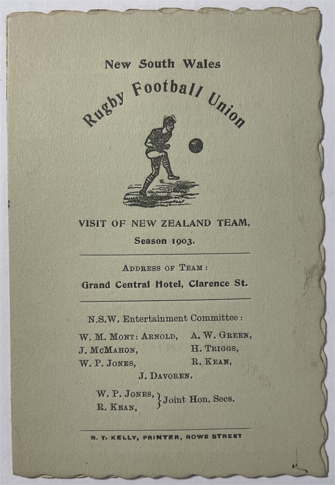 NSW Rugby Football Union Visit of New Zealand Team season 1903 Programme of Engagements. Scalloped edges and gold trim. Team listed on verso. Printed R.T. Kelly, Printer, Rowe St. Spine slightly torn. In VG condition. Each auction will remain OPEN for 5 minutes after the last bid has been made.