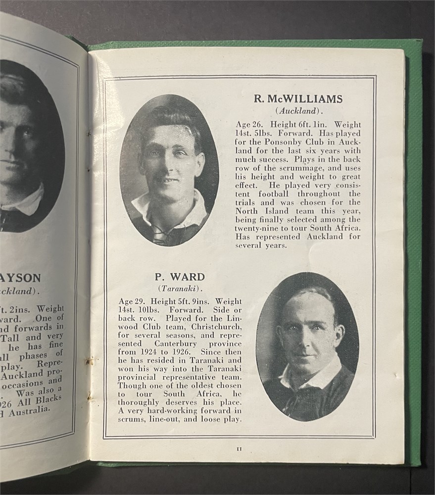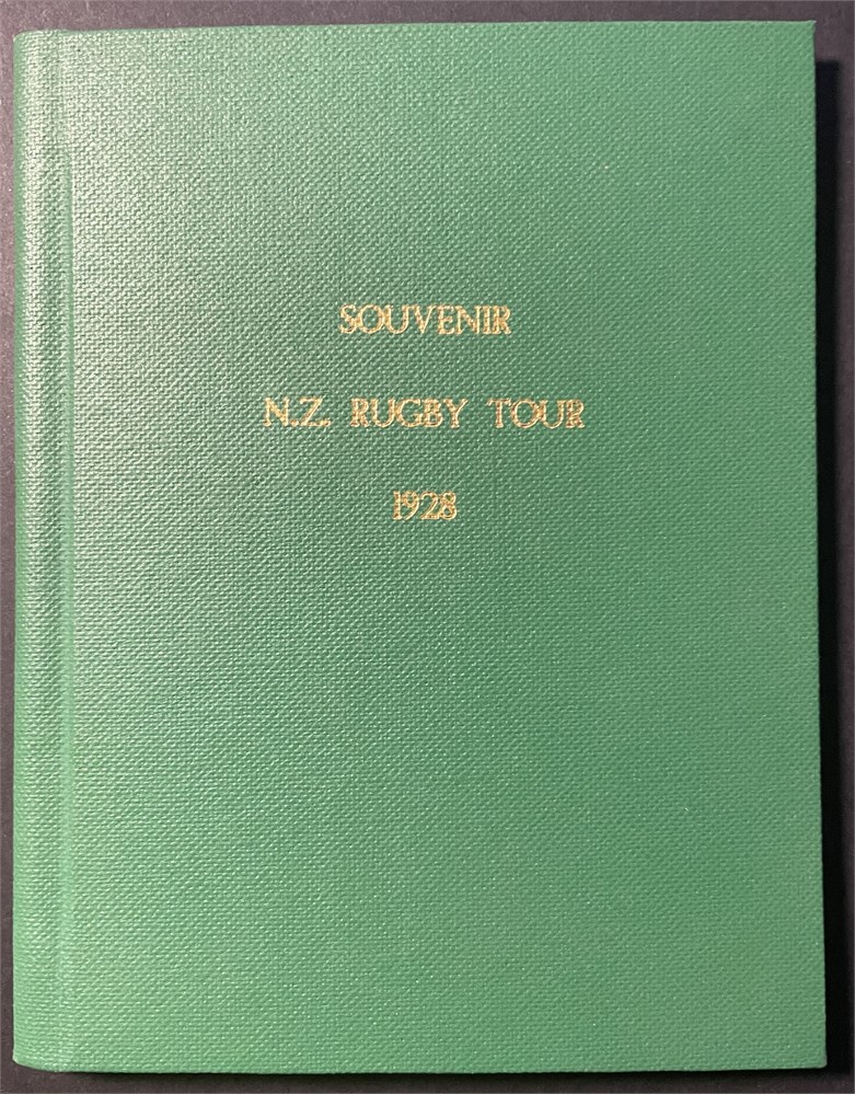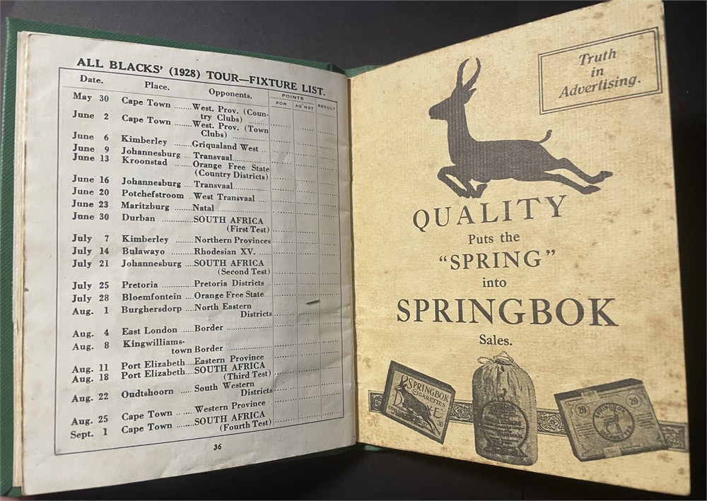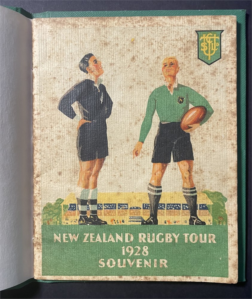 New Zealand Rugby Tour 1928 Souvenir. Produced by The United Tobacco Cos (S.) Ltd. 36 pages. Bound in green covers. A scarce booklet. Great colour cover (similar were done for Australian cricket tour) Original cover foxing. Pen pics of NZ team and fixture listings. Each auction will remain OPEN for 5 minutes after the last bid has been made.