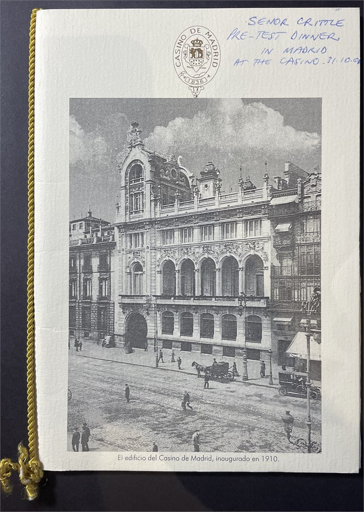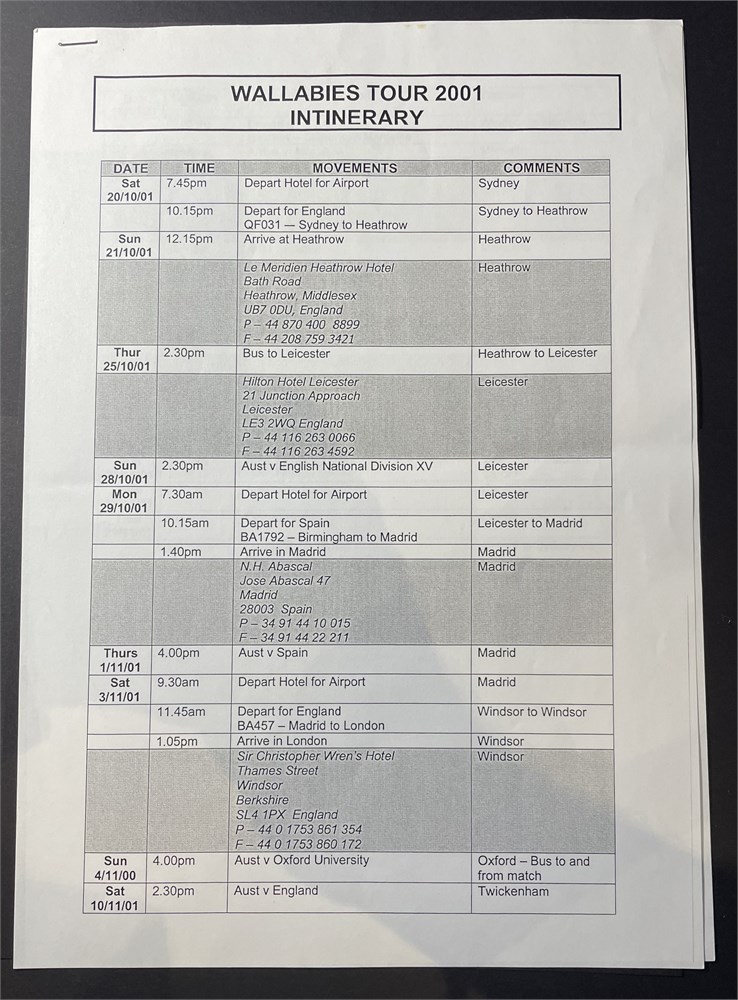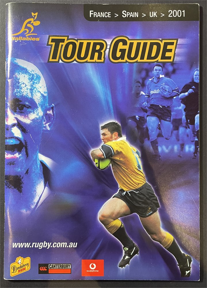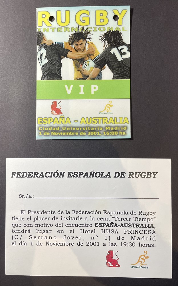 A 2001 Spain v Wallabies collection. 1. Tour Guide France, Spain, UK 2001. 2. Printed wallaby Tour 2001 Itinerary. 3. Handwritten menu Pedro Larumbe Restaurante, Madrid. 4. Menu pre-test dinner in Madrid at casino 31/10/2001. 5 VIP Pas 6. Federation Espanola de Rugby invite. Each auction will remain OPEN for 5 minutes after the last bid has been made.