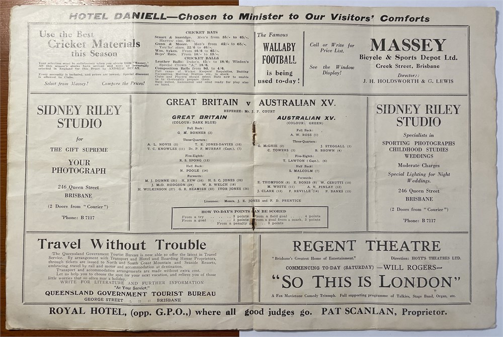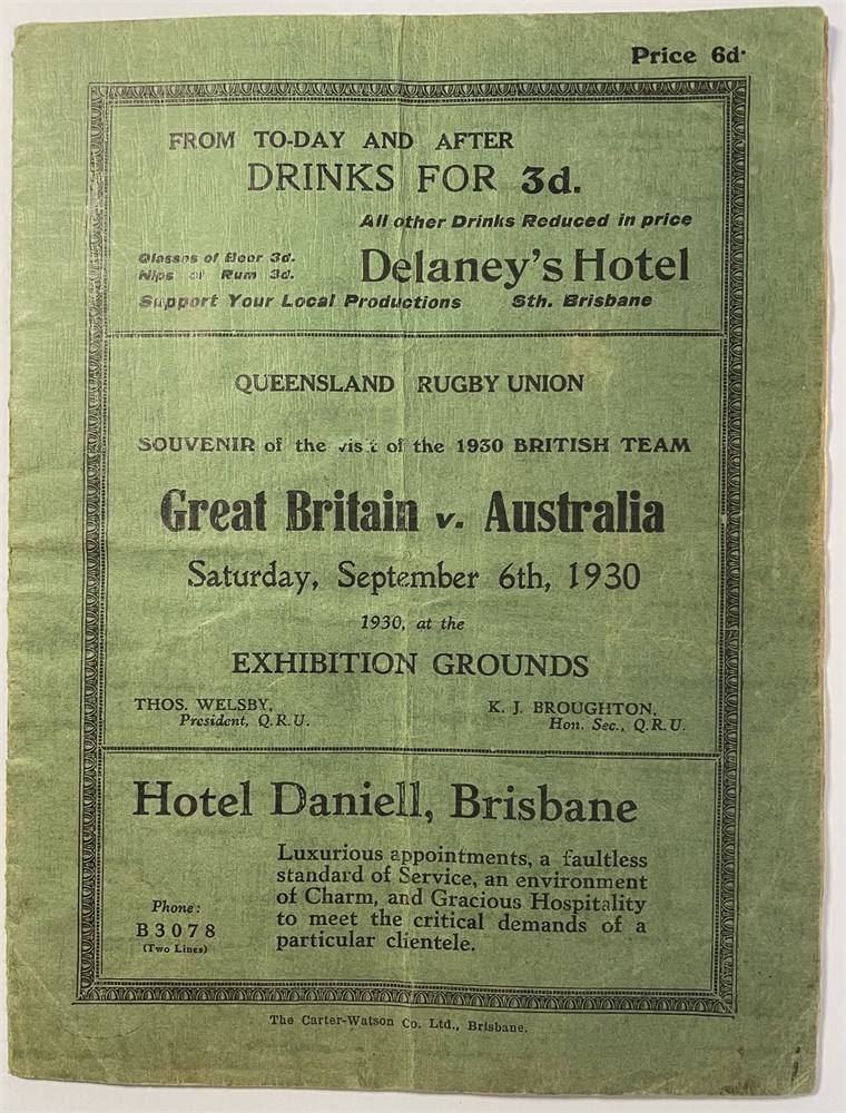 Brisbane Exhibition Ground. 6th September 1930. Cover scuffed and has a crease. Stales rusted and centre team list detached. In good condition. Rare copy of this programme. Each auction will remain OPEN for 5 minutes after the last bid has been made.