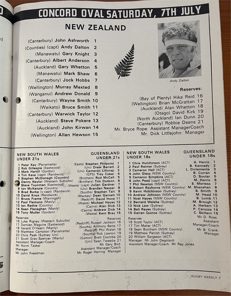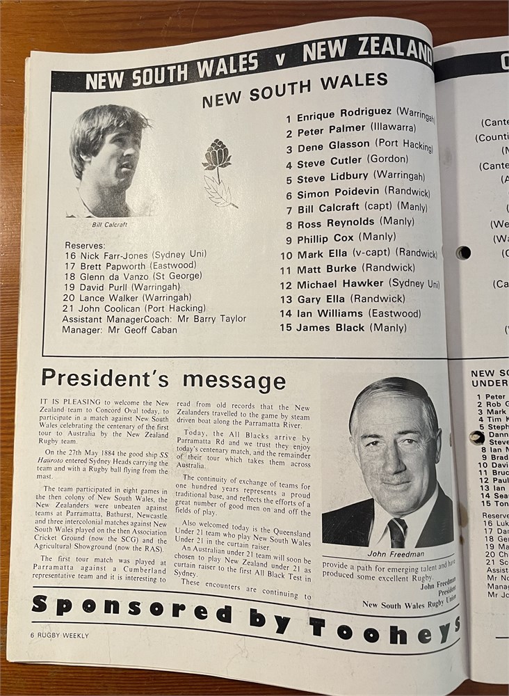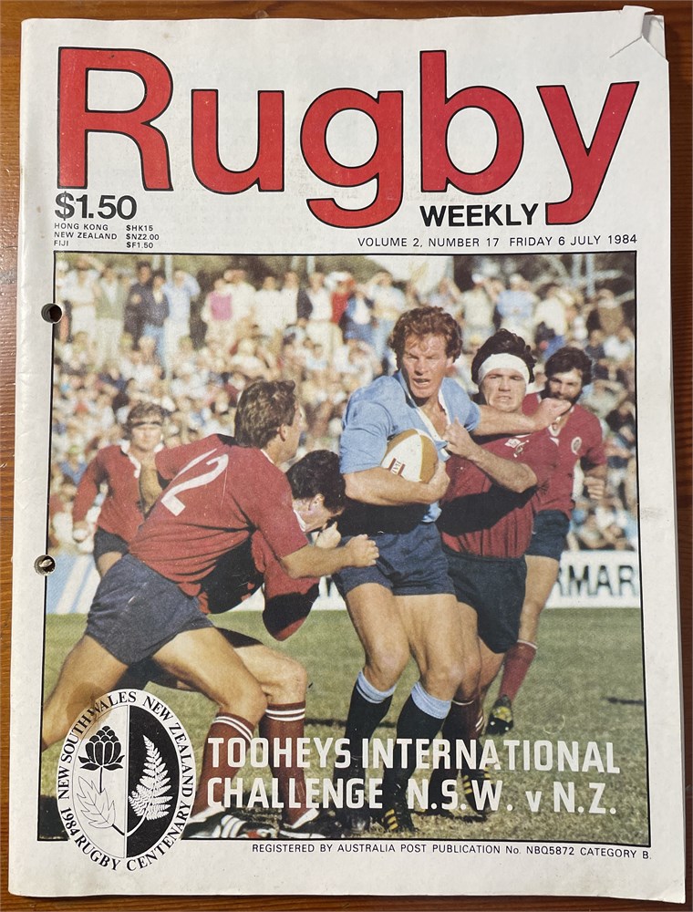 Rugby Weekly Vol 2 Number 17. Concord Oval 7 July 1984. Centenary Match of NZ's first tour to Australia in 1884. Holes punched. In Good condition. NSW Jersey from match also being separately auctioned. Each auction will remain OPEN for 5 minutes after the last bid has been made.