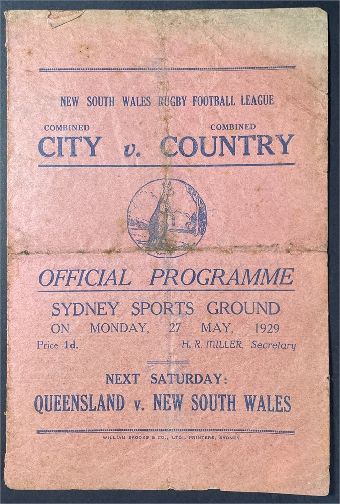 NSWRFL Official programme Sydney Sports Ground Monday 27 May 1929. Cover poor, has 2 folds. In poor condition. Each auction will remain OPEN for 5 minutes after the last bid has been made.