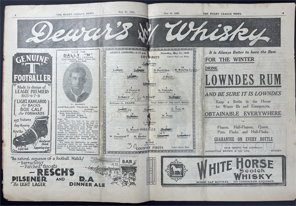 The RL News Vol. 11. No. 6. City v Country Sports Ground 31 May 1930. Team sheet notes changes and scores in Pencil. In Poor to Good condition. Has been folded. Each auction will remain OPEN for 5 minutes after the last bid has been made.