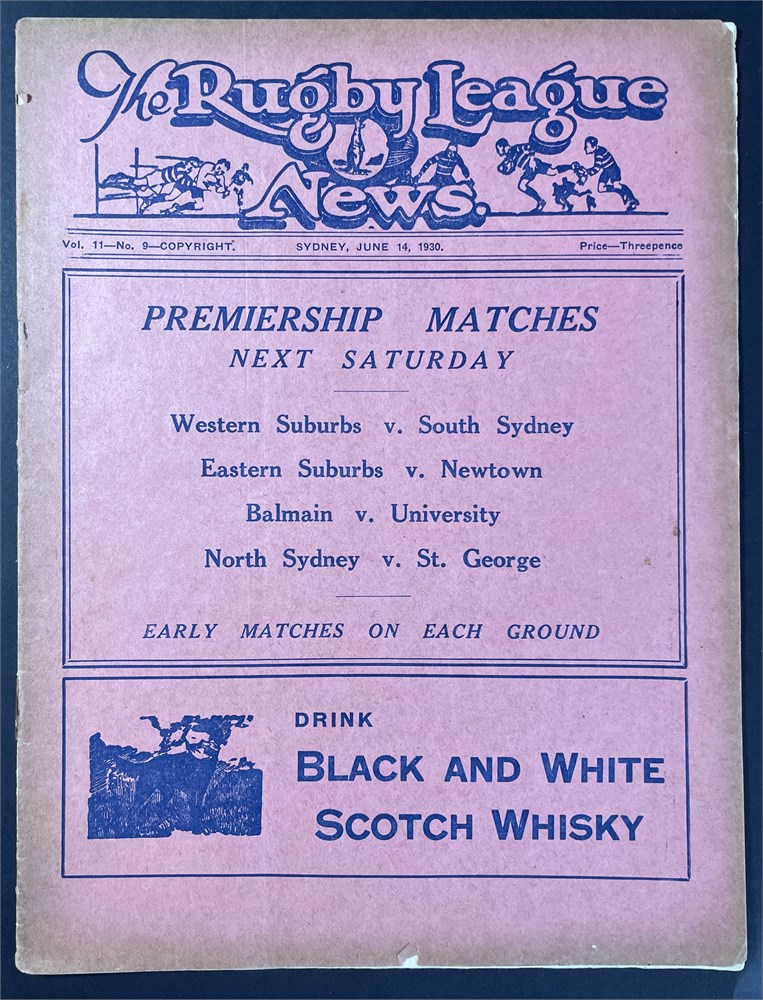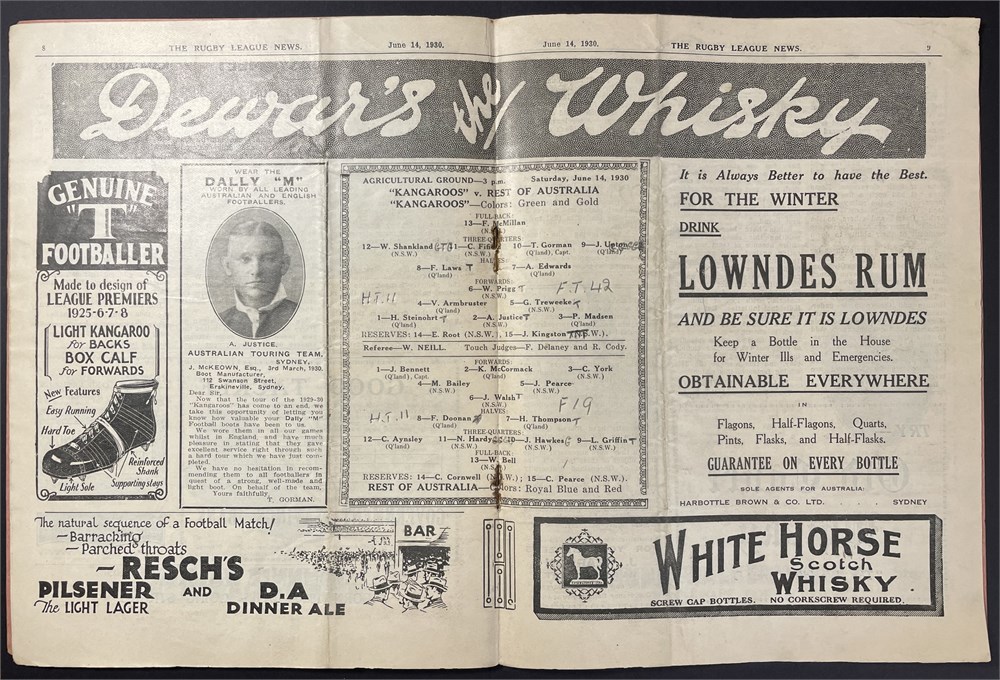 The RL News Vol. 11. No. 9 '1929 Kangaroos v The Rest. played 14 June 1930. Sydney Agricultural Ground. Scores and scorers noted in pencil. Creased. In Good condition. Each auction will remain OPEN for 5 minutes after the last bid has been made.