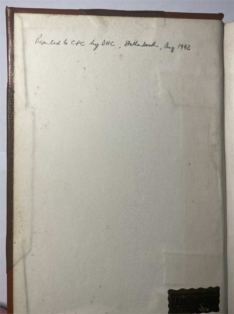 Half leather bound. Signed on cover by Danie Craven and pencil note; 'Presented to CPC by DHC, Stellenbosch Aug 1992'. Kaapstd Nationale Pers Bepeek 1949. 251 numbered pages. Each auction will remain OPEN for 5 minutes after the last bid has been made.