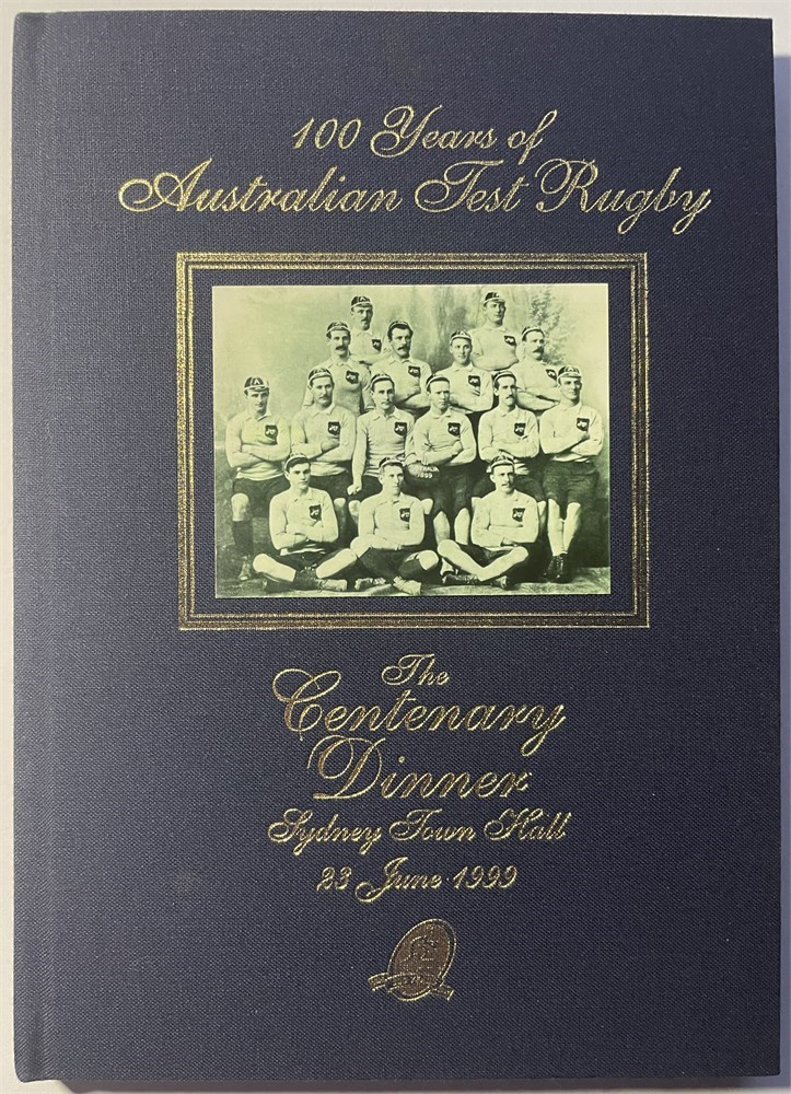 1999 A hardcover booklet of 48 pages. Dinner at Sydney Town Hall celebrating 100 years of Australian Test Rugby. Comes with ARU letter to Peter Crittle to the Test on 26th June 1999. His place name from table.