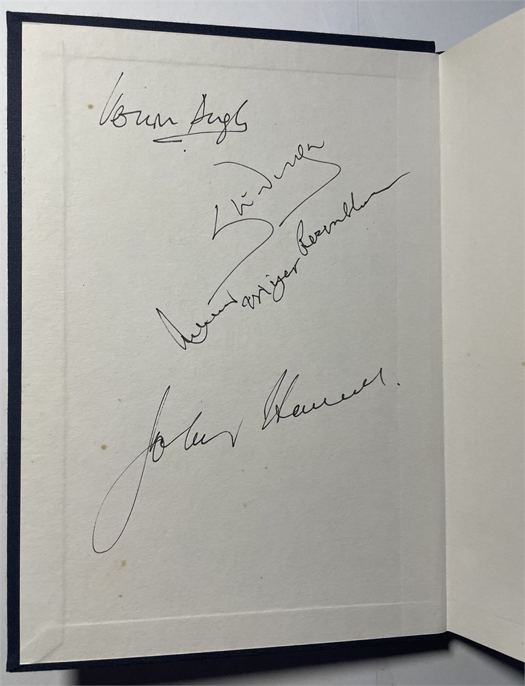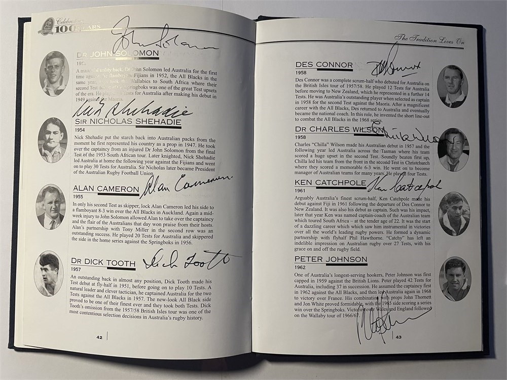 Inside cover signed by Vernon Pugh (iRB Chairman) Steve Waugh (Test cricketer), Myer Rosenblum (Former Wallaby 4 tests 1928) and John Howard (Australian Prime Minister).
