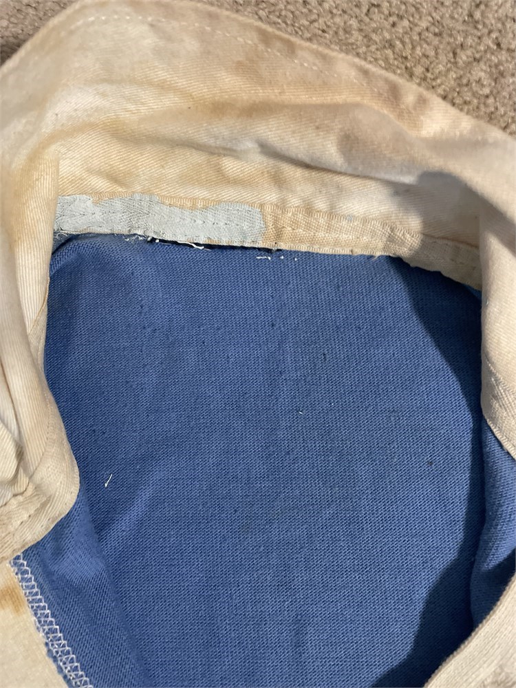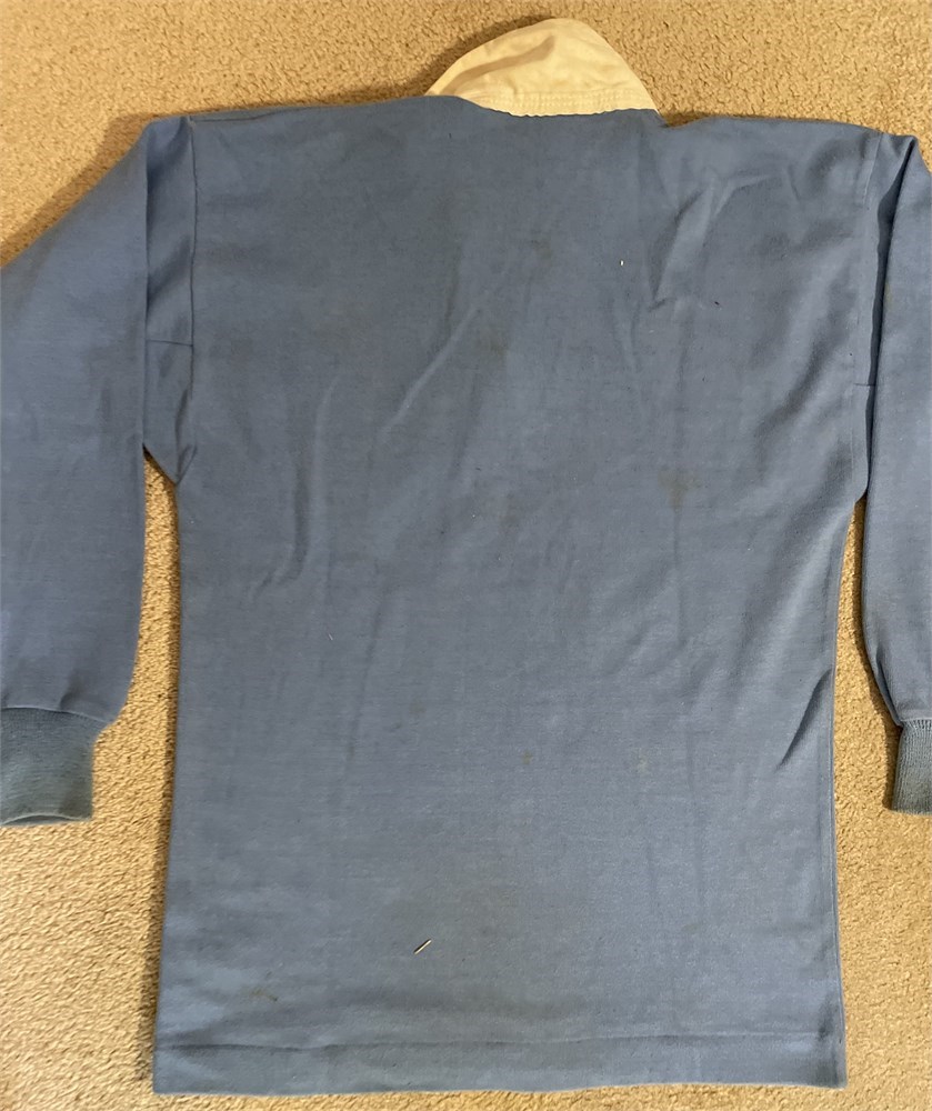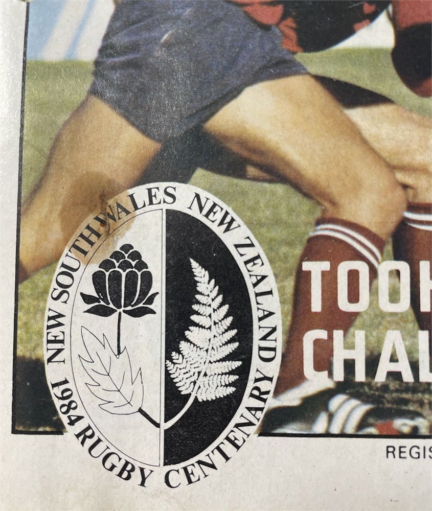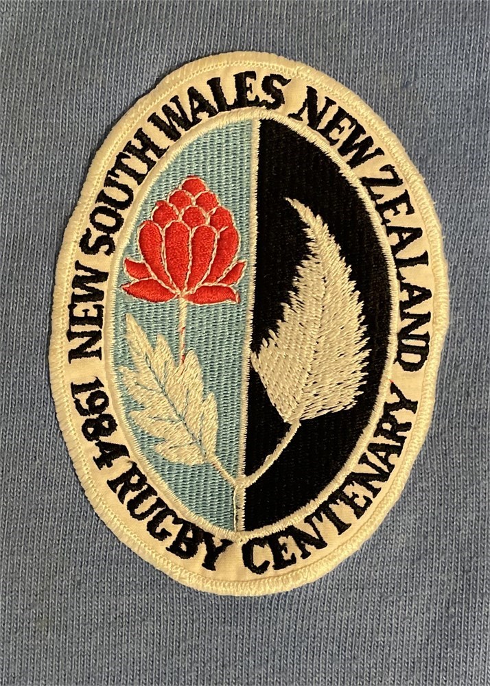 A New South Wales jersey with commemorative badge created for the 1984 match between NSW and NZ. This was the Centenary of NZs first tour to Australia in 1884. Badge Waratah and Fern with 'New South Wales New Zealand 1984 Rugby Centenary'. Jersey has no maker's label and blue paint to inside of collar. Substantial markings on jersey. No number. In Good condition. The match programme (is shown) but is being offered separately.