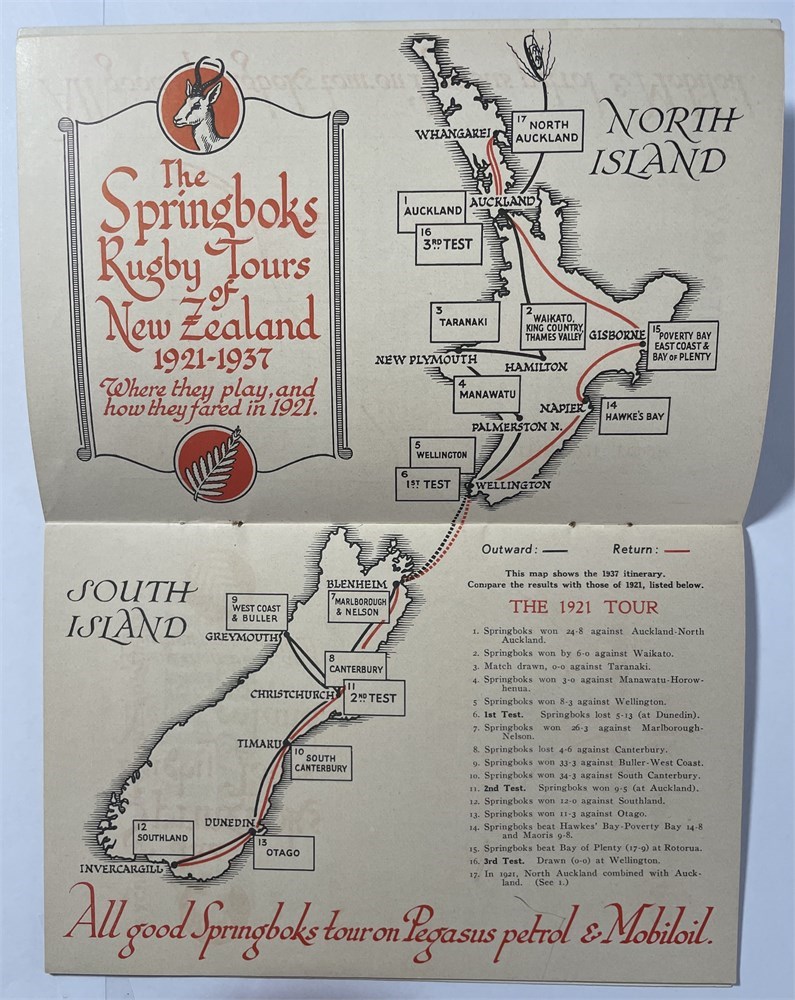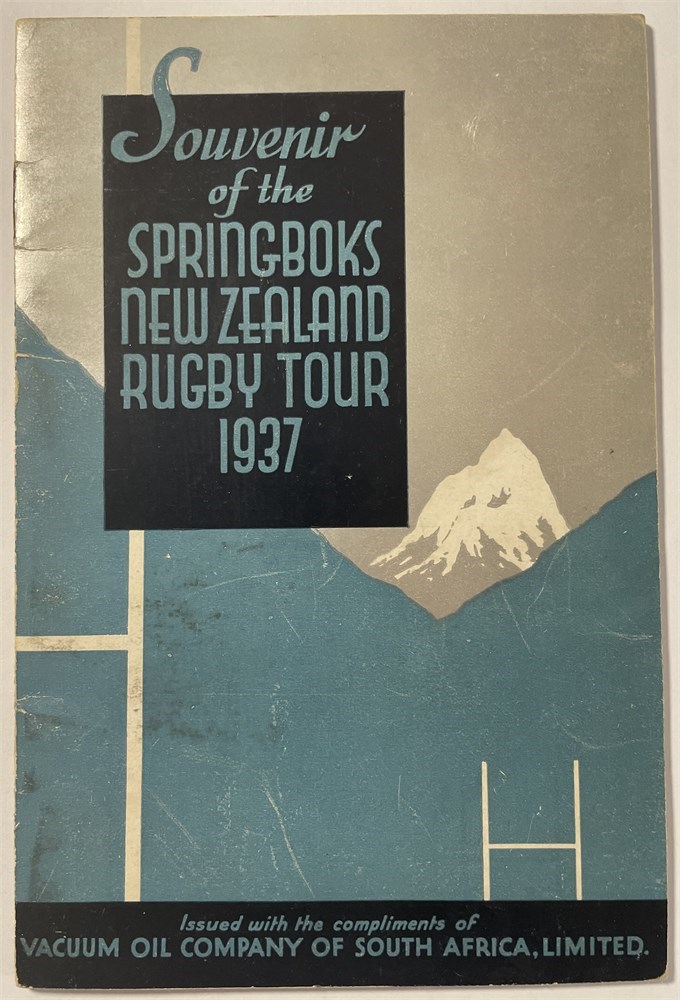 'Souvenir of the Springboks New Zealand Tour 1937' Issued with the compliments of the Vacuum Oil Company of South Africa, Limited. 24 pages. Printed Galvin & Sales Ltd Cape Town. Slight scuffing to cover but in VG condition.