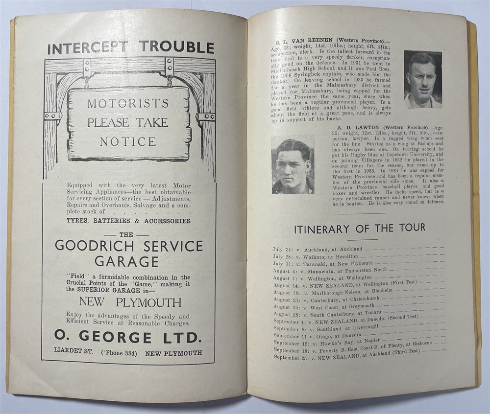 1937 Taranaki Rugby Almanac Springbok Souvenir. Published by the Hawera Star Publishing Co Ltd. 48 unnumbered pages. Cover scuffed and faded at spine. In Good condition.