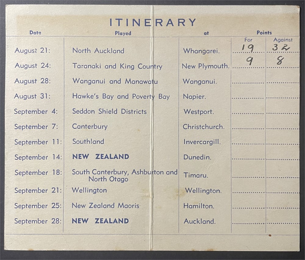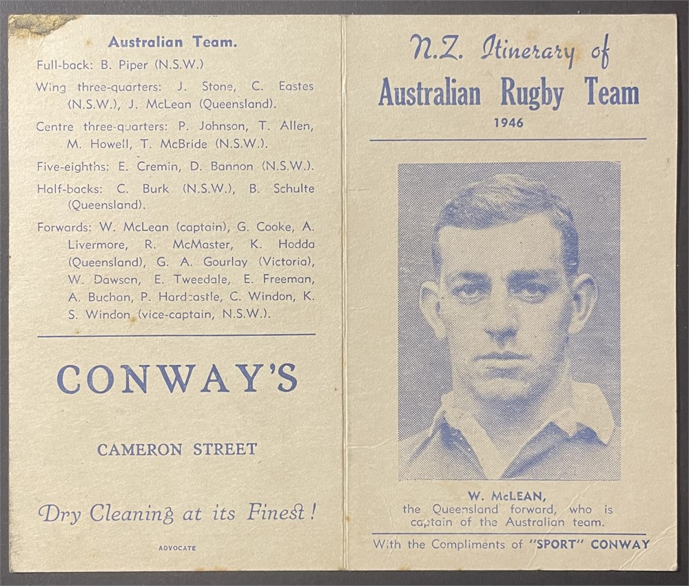 NZ Itinerary of Australian Rugby Team 1946. With the compliments of "sport Conway" Single fold card with matches listed and team noted, G. Each auction will remain OPEN for 5 minutes after the last bid has been made.