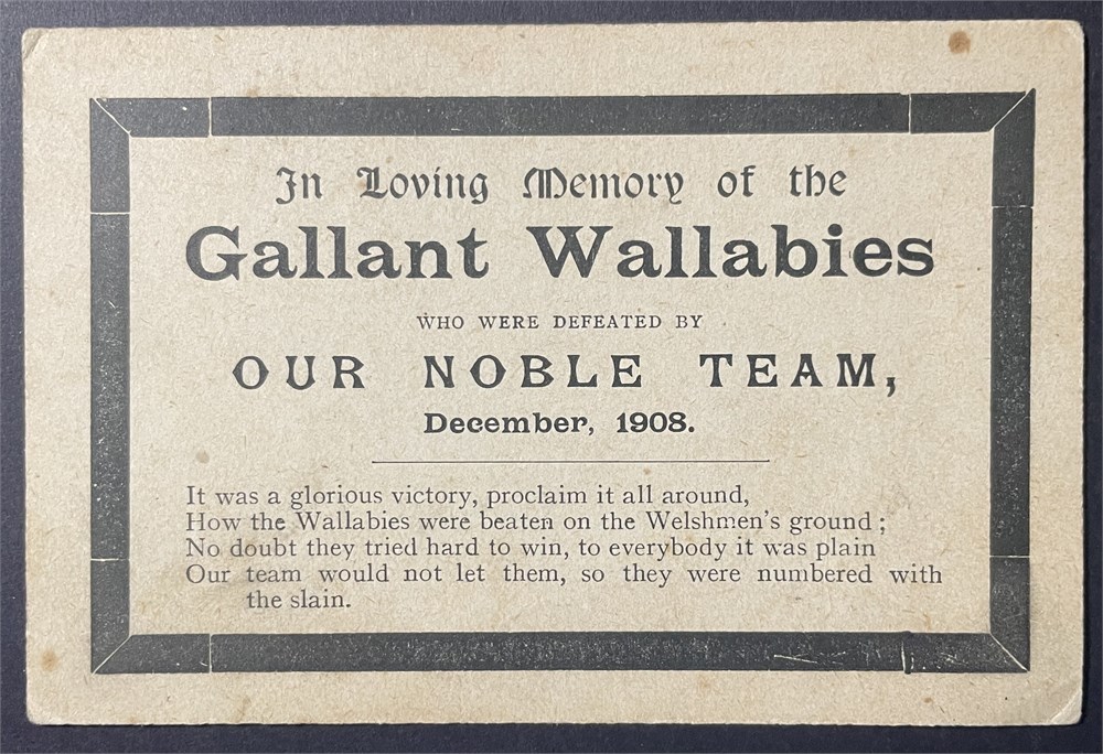 "in loving memory of the Gallant Wallabies who were defeated by our Noble team, December 1908"..VG condition, some foxing.