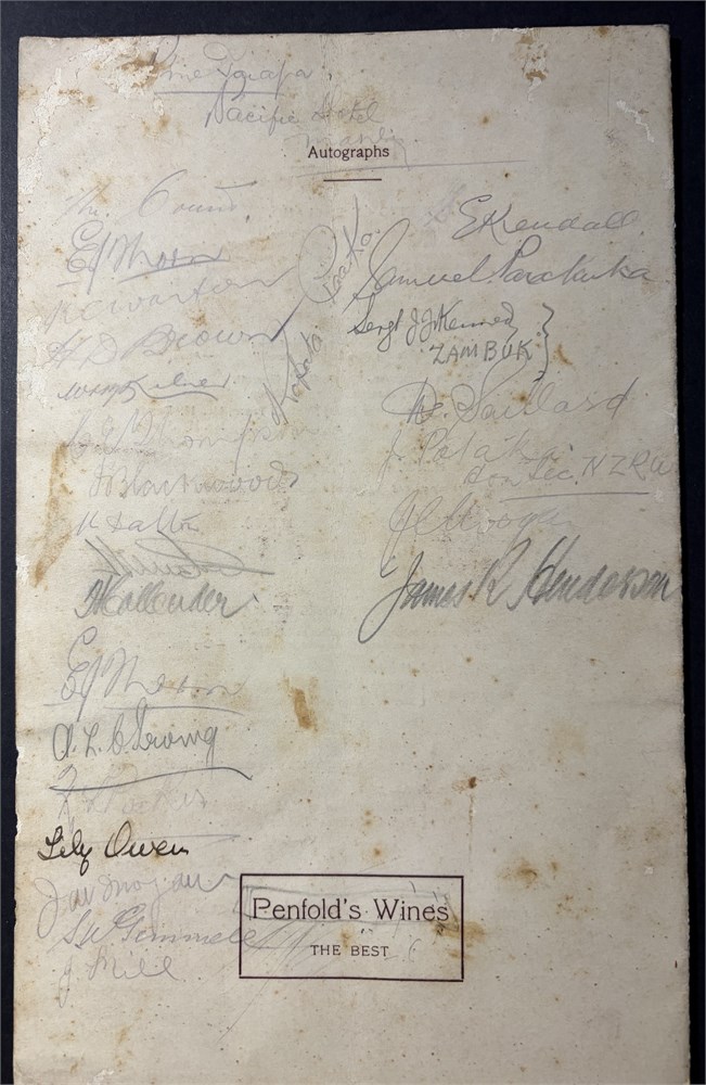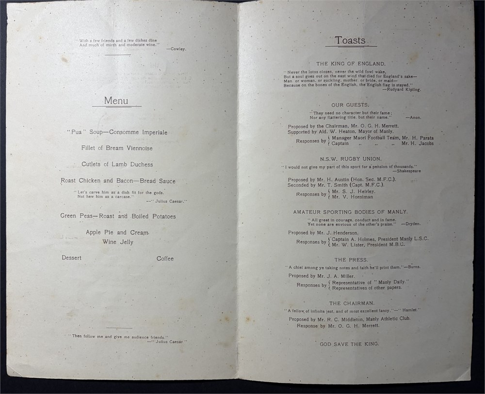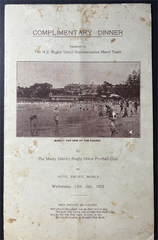 Dinner by Manly District RUFC for NZ RU Rep. Māori team. At Hotel Pacific, Manly. Following the Māori v NSW 2nd XV match played at Manly. Signed by 25. Māori Jimmy Mill, Sam Gemmell, Sammuel Parakuka, NSW J. Blackwood. Admin James R. Henderson and J. Palaka Hon. Sec NZRU. Front cover obtained a poem MEN SHOULD BE JUDGED ..