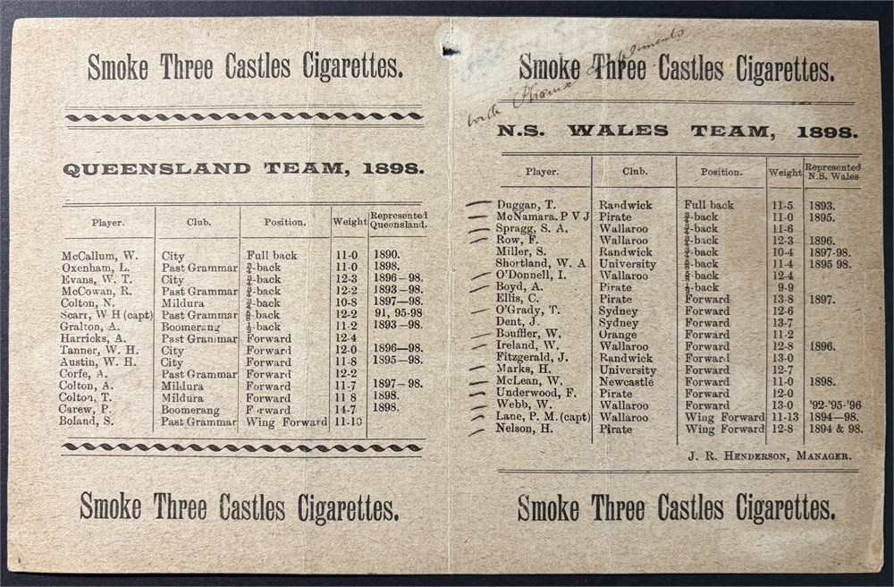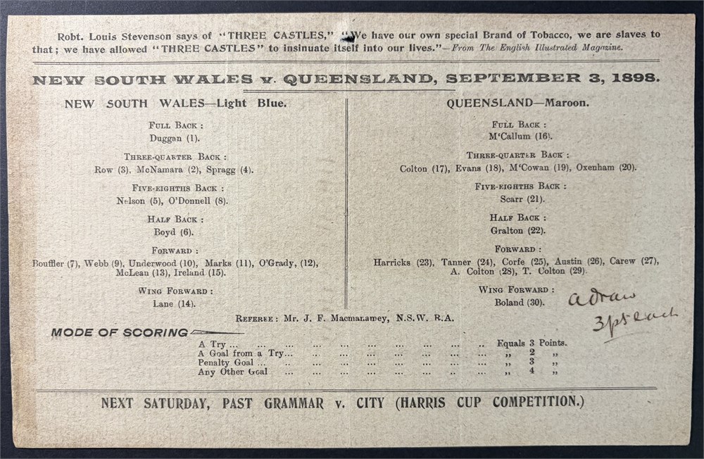 Card with single fold. I assume in Brisbane. 3-3 draw. Both sides numbered NSW16 - 30 and QLD 1-15.