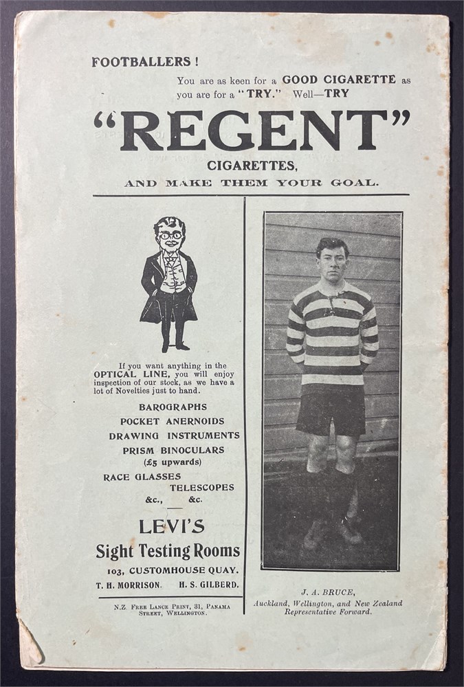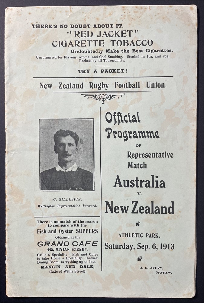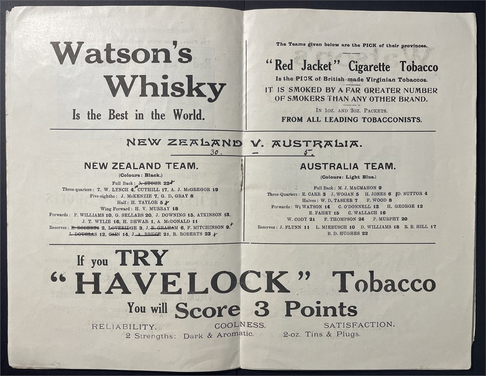 Sat Sept 6th, 1913 Athletic Park. Numerous pages. Changes noted to NZ side.' T' for try next to player and score 30-5 noted. Staples rusted, cover foxed G to VG.