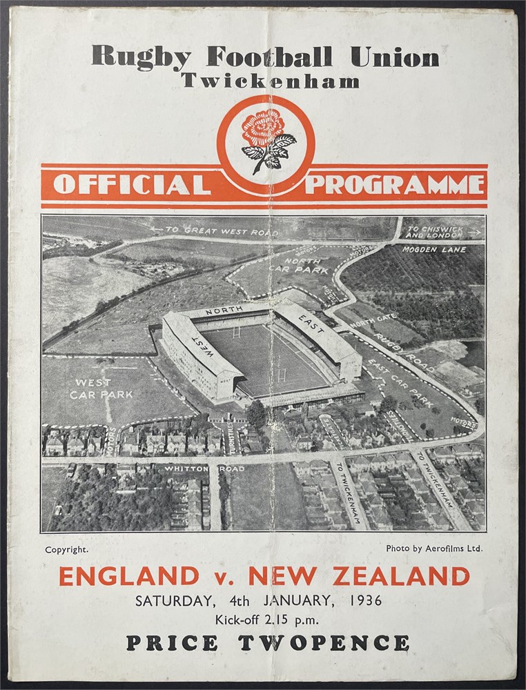 Sat, 4th Jan, 1936. Twickenham. Card with single fold. Has 1 crease and team sheet soiled. Poor condition.
