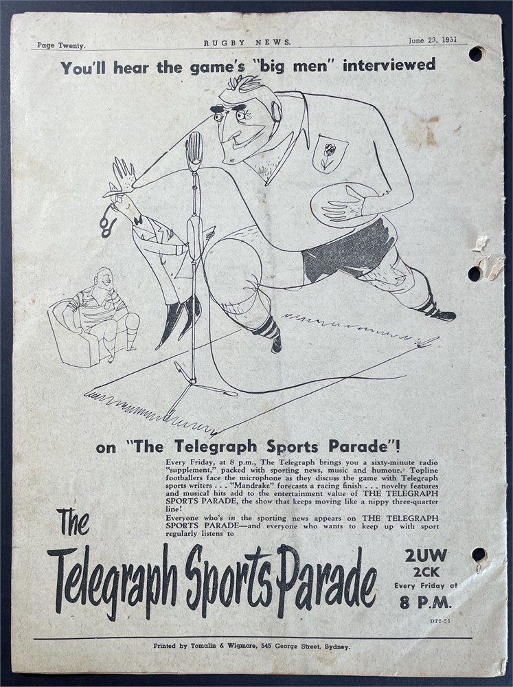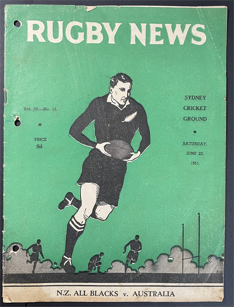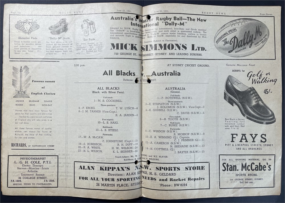 Sat June 23, 1951 Sydney Cricket Ground. Three holes punched, cover sl. soiling and small tear. Good condition.