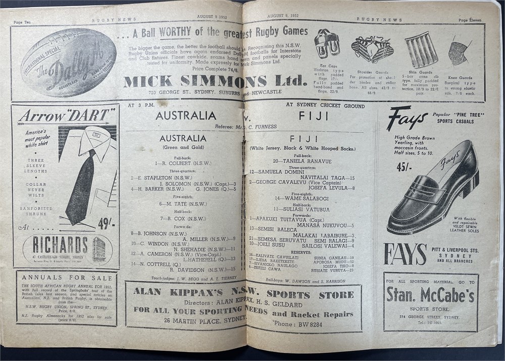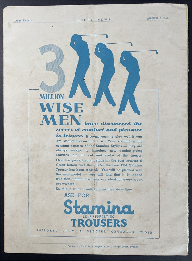 Sat 9 August 1952. Sydney Cricket Ground. Rugby News. Ne crease. Very Good.