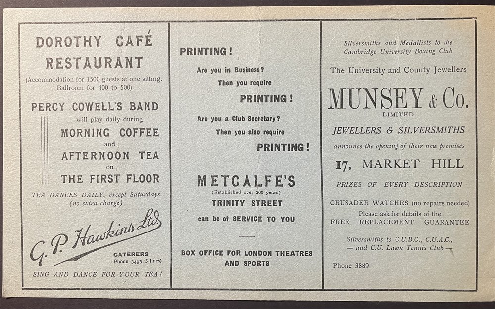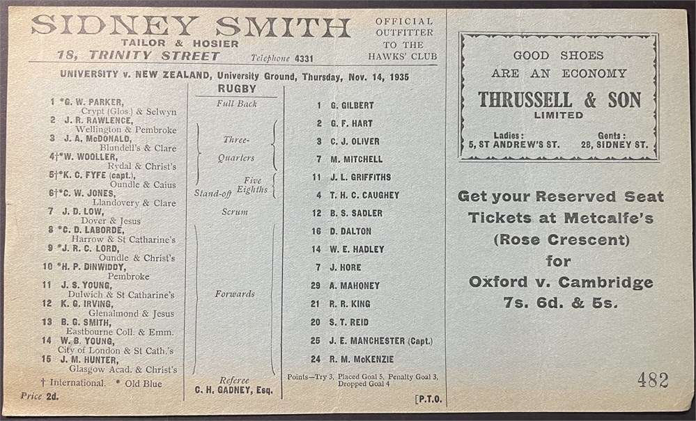 Thur. Nov. 14, 1935. Single card, some discolouration to team sheet. VG.