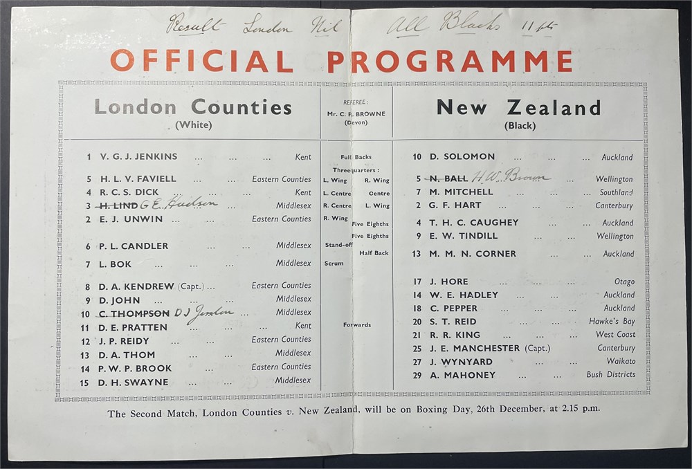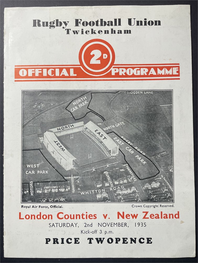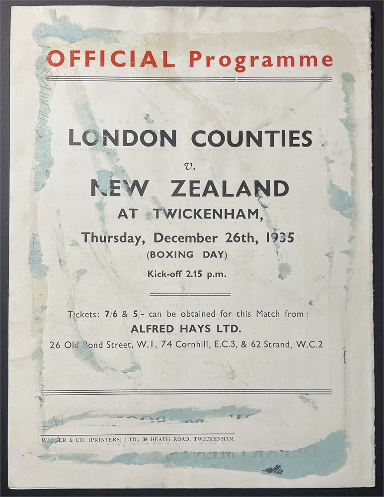2nd Nov 1935, Twickenham. Sigle card folded. Result written on team sheet, as are team changes. Was stuck in a scrapbook. G to VG.
