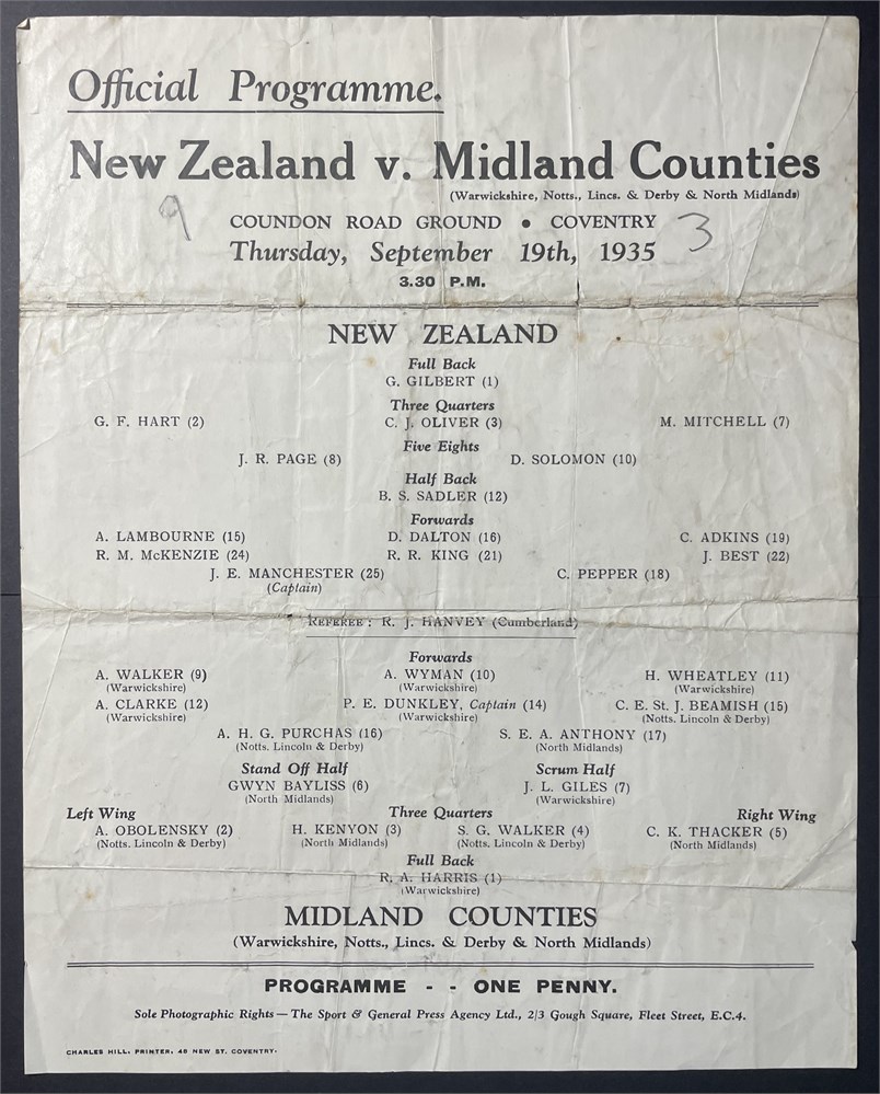 Thur, Sept 19th 1935. Coundon Road Ground, Coventry. Single sheet with multiple creases. Soiled. Score written. Poor.