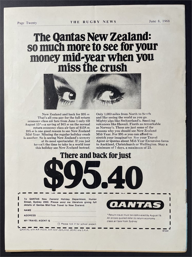 Saturday June 8th, 1968. Sydney Sports Ground. Rugby News Vol. 46 No. 19. Excellent condition.
