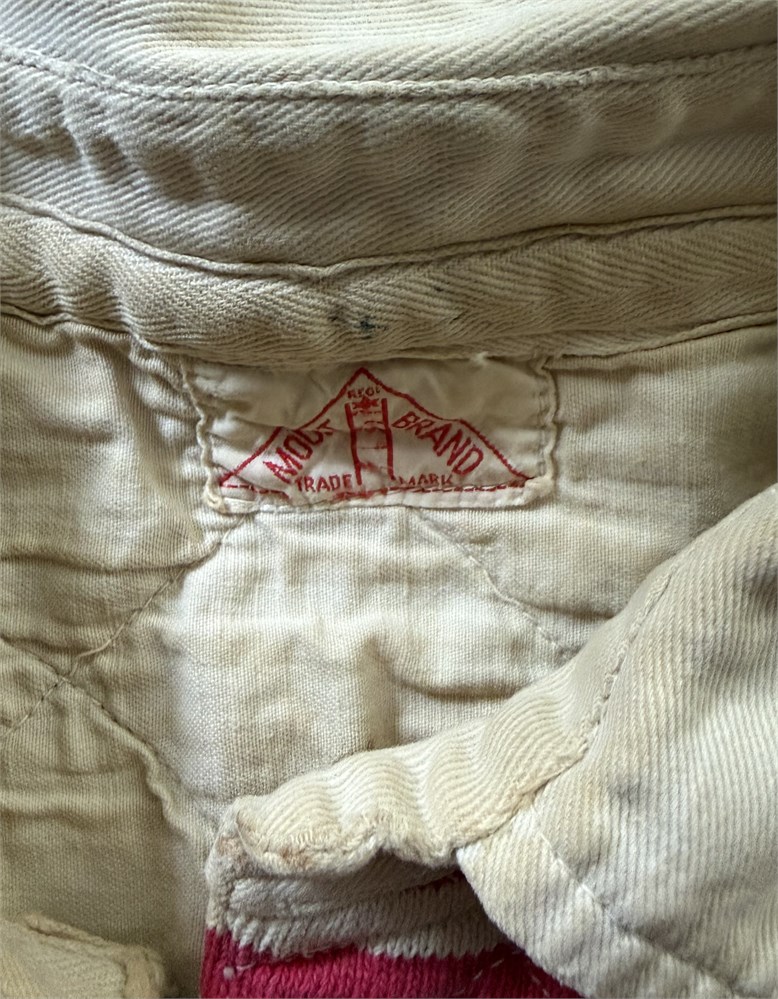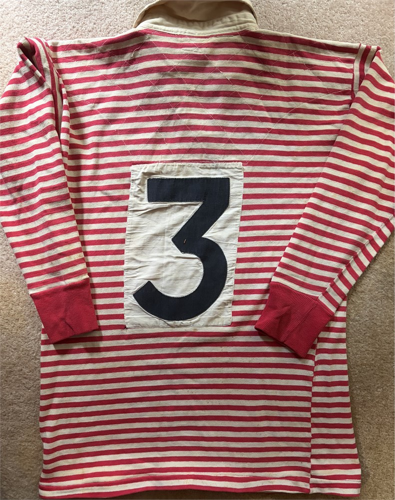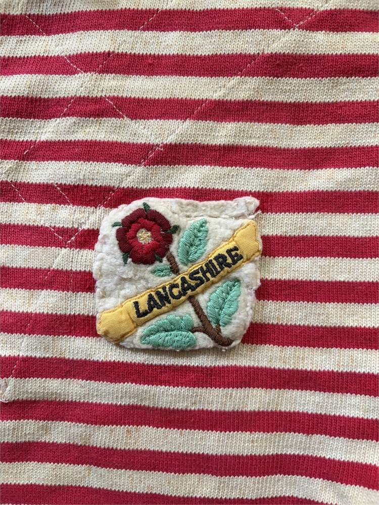 Lancashire Jersey (red and white stripes) # 3. Made by MOUNT BRAND TRADE MARK. Cross stitched across shoulder. Badge in felt and cotton embroidery. # 3 on black on white patch. Some foxing. May be late 1950s or 1960s.From the Peter Crittle Collection.
