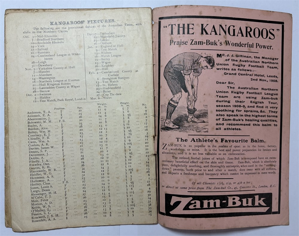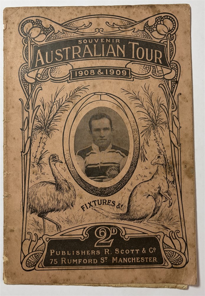 Souvenir of Australian Tour 1908 1909. Published by R. Scott and Co, 75 Rumford St, Manchester. 16 un-numbered pages. Photos of teams. Lisy of fixtures and team list. Single rusted stapes. In Poor to Good condition. Foxing. Each auction will remain OPEN for 5 minutes after the last bid has been made.