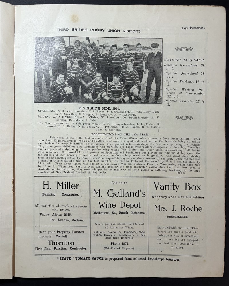 Souvenir of British Team's visit to Queensland 1924. 36 pages. Cover scuffed and foxed Poor to Good. Internals Good to VG.