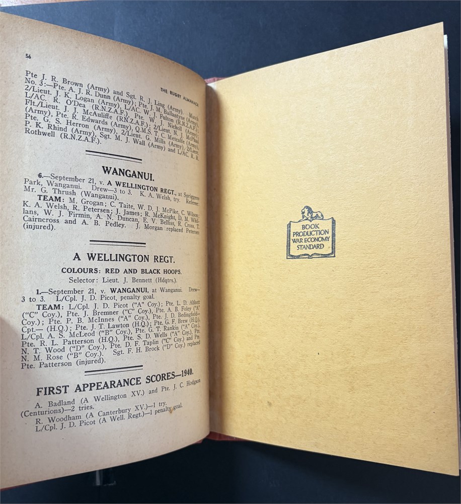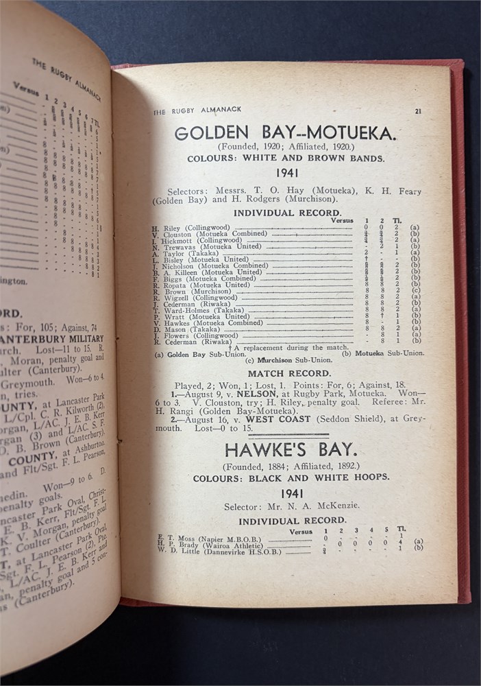 The Rugby Almanack of New Zealand 1942/3. Carman, Swan and Masters. Bound in brown linen. Has original covers. In excellent condition.