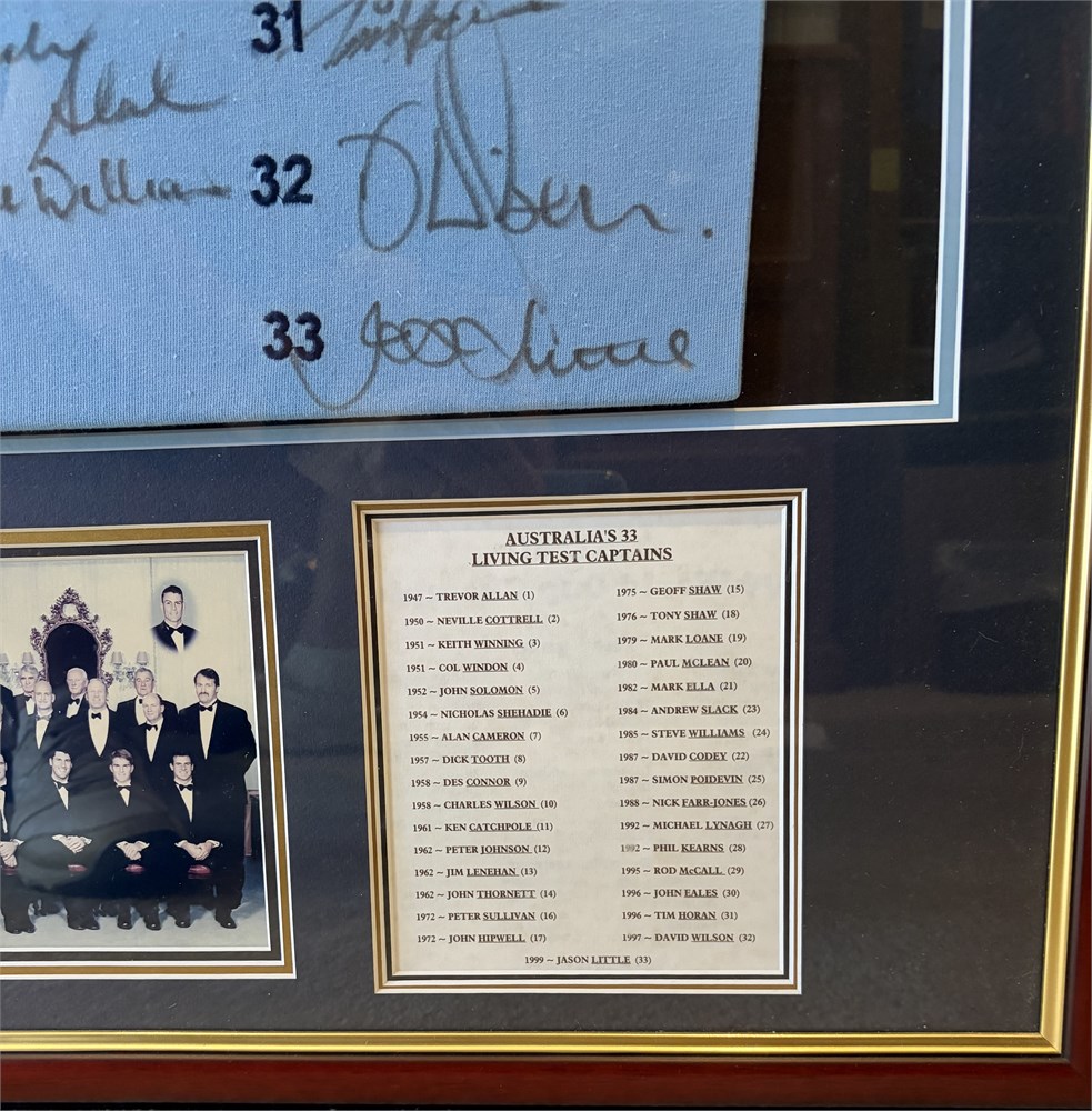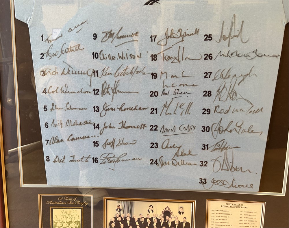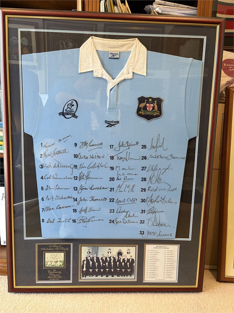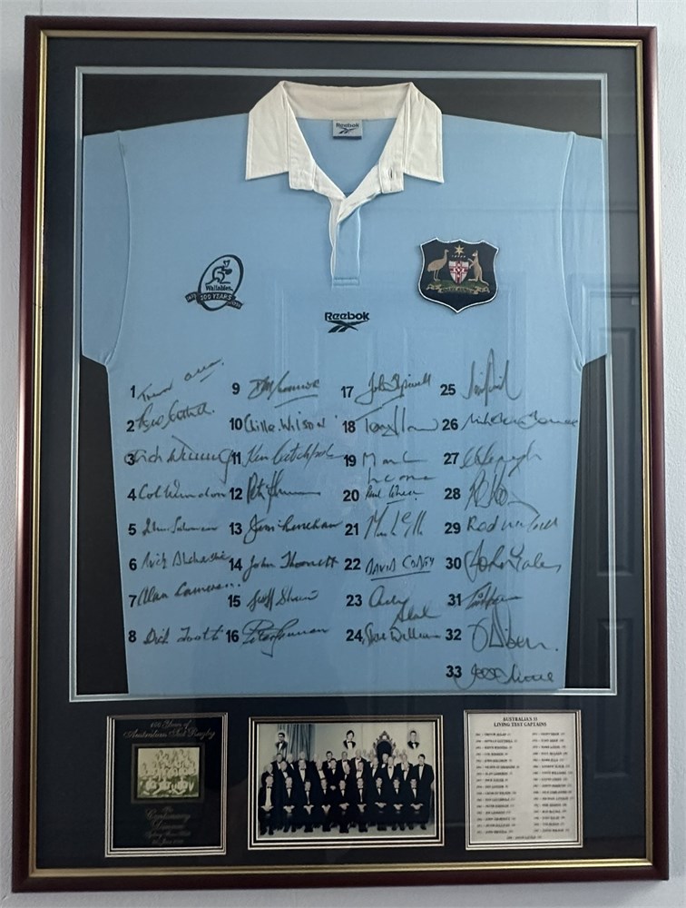To celebrate the centenary of Test rugby, the Wallabies played a Centenary Test v England in 1999 wearing the original sky-blue jersey used in their first test in 1899. This framed jersey is a replica of the jersey they played in for the Centenary test, and is signed by the 33 living Wallaby captains who assembled for the 100 year Centenary dinner at the Sydney Town Hall in the days before the Centenary Test.