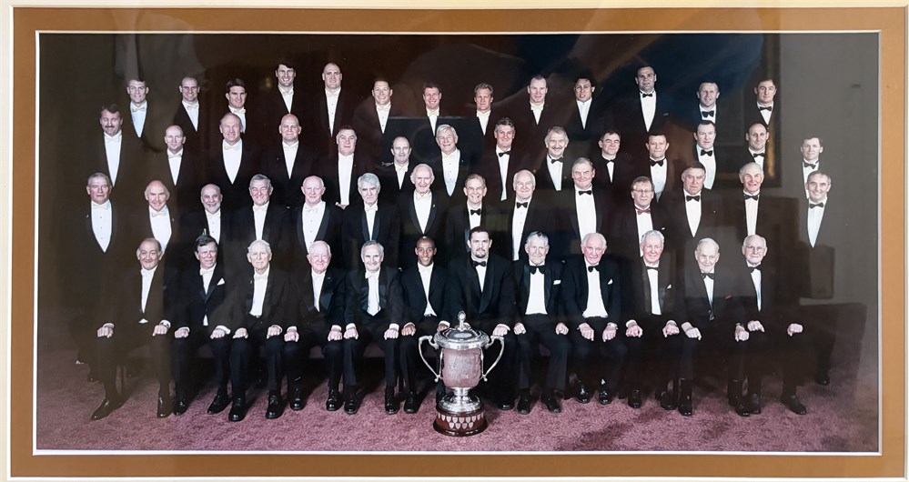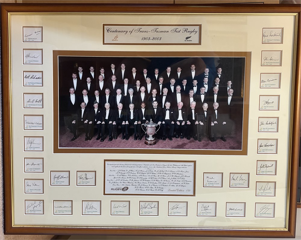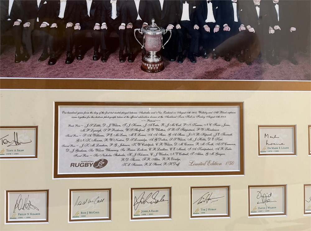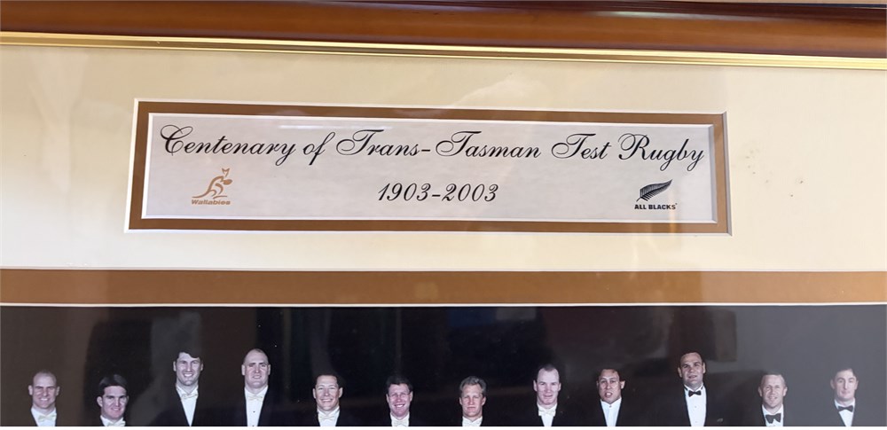 Centenary of Australia New Zealand Test rugby (Wallaby & All Blacks Captains photo) This is #1 of 50. The picture was taken at the black tie NZ Rugby Centenary dinner in 2003, and features the 29 Australian captains who attended that dinner (wearing gold bow ties) and the All Black captains in attendance who wore black bow ties.