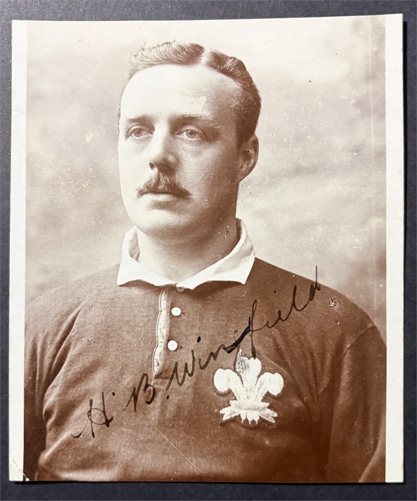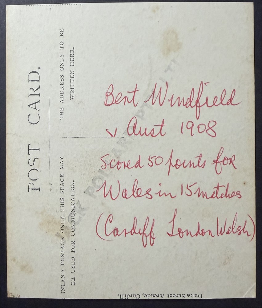 Unused has been cut. Signed. To verso "Bert Windfield v Aust 1908 scored 50 points for Wales in 15 matches." (Cardiff London Welsh)