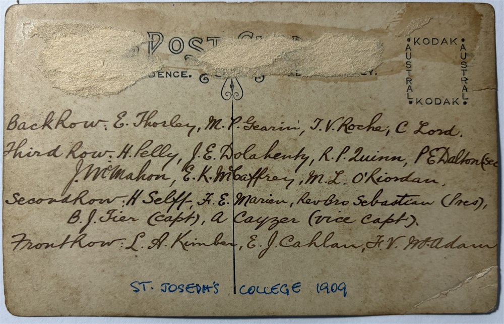 St Joseph's College, Hunters Hill, Sydney. 1st XV. Team list written on verso. Joeys were 3rd in the GPS competition that season.