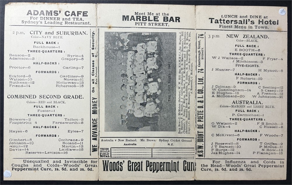 Sydney Cricket Ground. 1st Test of the series (Australia's 10th test) A single card with two folds. Some damage to fold - i.e. torn. In Good condition. Published NSW Bookstall Co and Printed by The Swift Printing Co. Sydney.